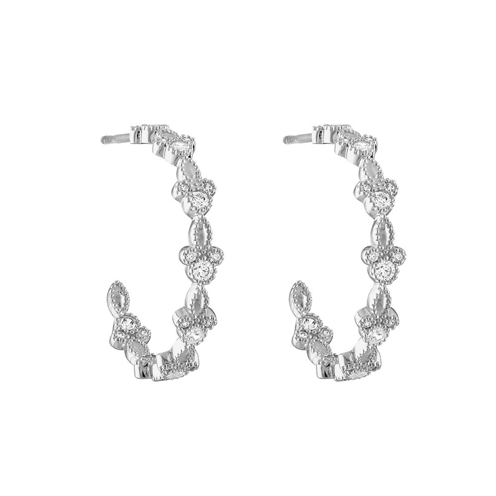 Mickey is all-ears for fine fashion with these sterling silver hoop earrings by Rebecca Hook, studded with sparkling handset cubic zirconia. Featuring a ''daisy chain'' of gem encrusted mouse icons on each hoop, this elegant jewelry is sure to lend your look a touch of Disney magic!.