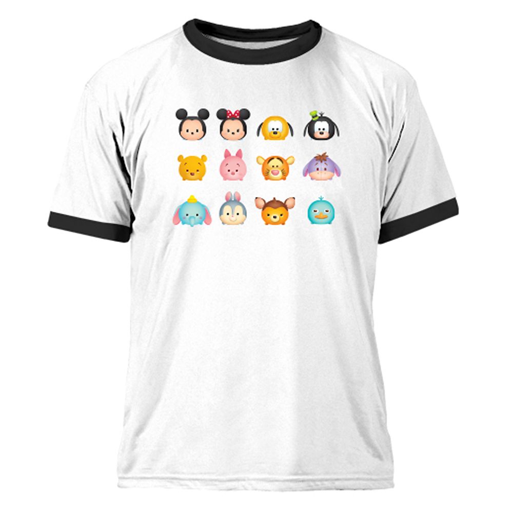 A dozen of your favorite Disney ''Tsum Tsum'' characters line up on the front of this ringer tee. Based on the original Japanese stackable plush figures, Mickey, and Goofy are among those pictured on this tee that's available in a choice of colors.