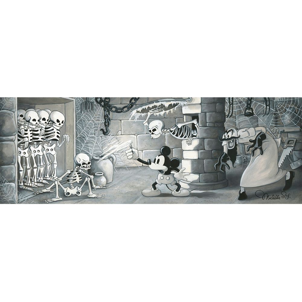 Mickey gets a fright when he disturbs some skeletons in this canvas artwork inspired by the 1933 black and white short The Mad Doctor. Created by artist Michelle St.Laurent, ''The Mad Doctor's Great Experiment'' is a limited-edition giclée canvas print that's gallery wrapped and ready to hang in your home without a frame.