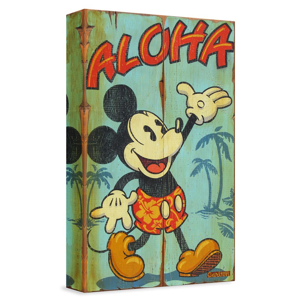 Mickey Mouse is vacation ready with an ''Aloha'' greeting on this giclée on canvas by Trevor Carlton. Our limited edition ''Welcome to the Islands'' comes gallery wrapped and includes a certificate of authenticity.