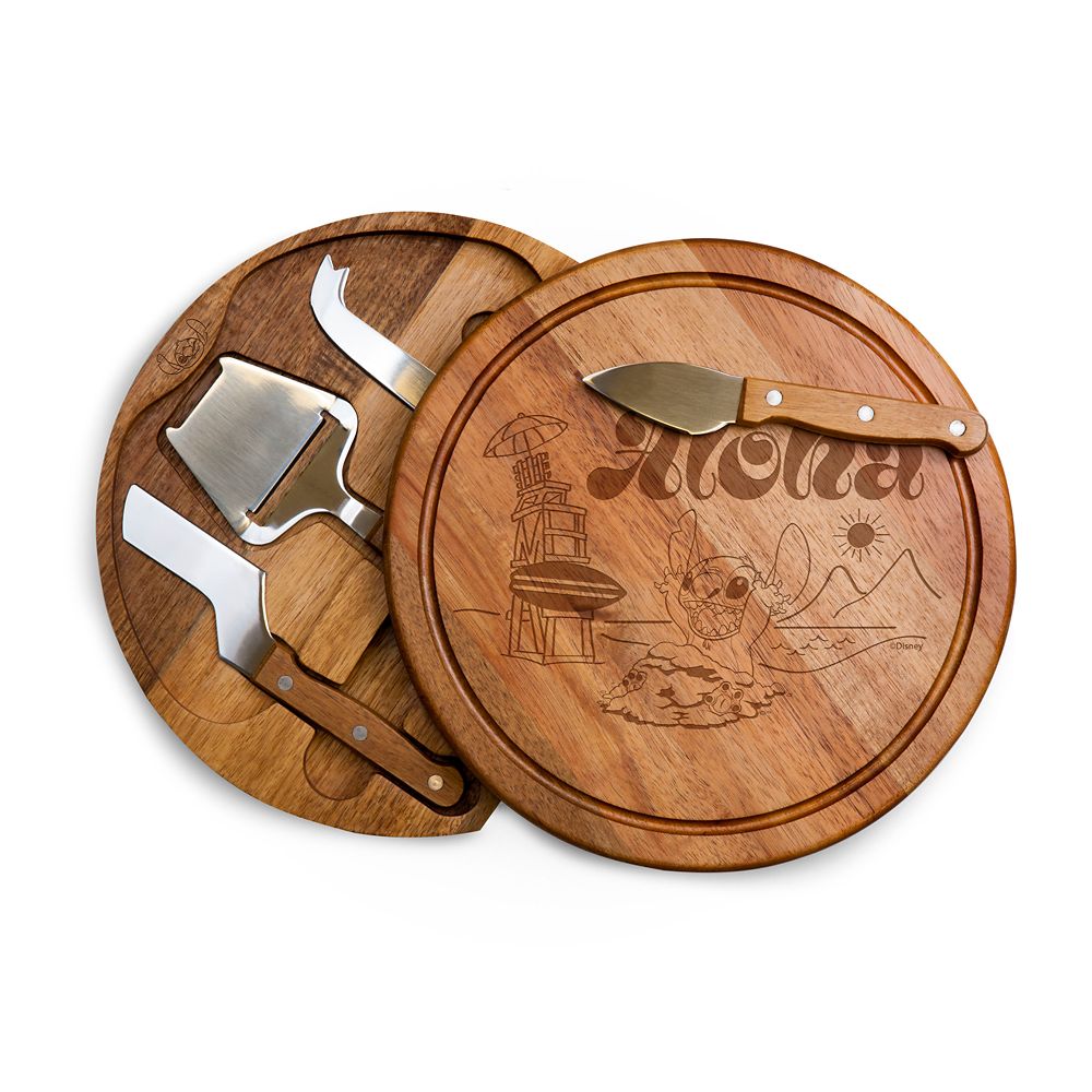 Who wants a snack? Silly question, especially when cheese, crackers, fruit or any other tempting treat is served on this Stitch cheese board. The top of the acacia wood board features art of Stitch at play on the beach under the word ''Aloha.'' The swivel-connected board opens to reveal four stainless steel tools that can be used on a variety of cheeses, charcuterie and more. Really, the only limit is your appetite and that certainly has never stopped Stitch.