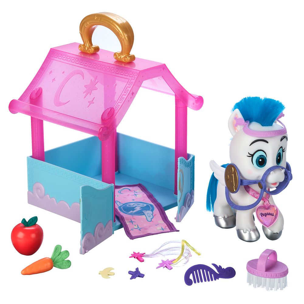 Now kids can learn to nurture their Disney Princess pets with this play set featuring a cute royal sidekick and an array of accessories for their imaginary habitat. Hercules' pet Pegasus is a flying horse in his own stable with glittering canopy! Comes with bed, hair extensions and clips, plus plenty more playtime extras.