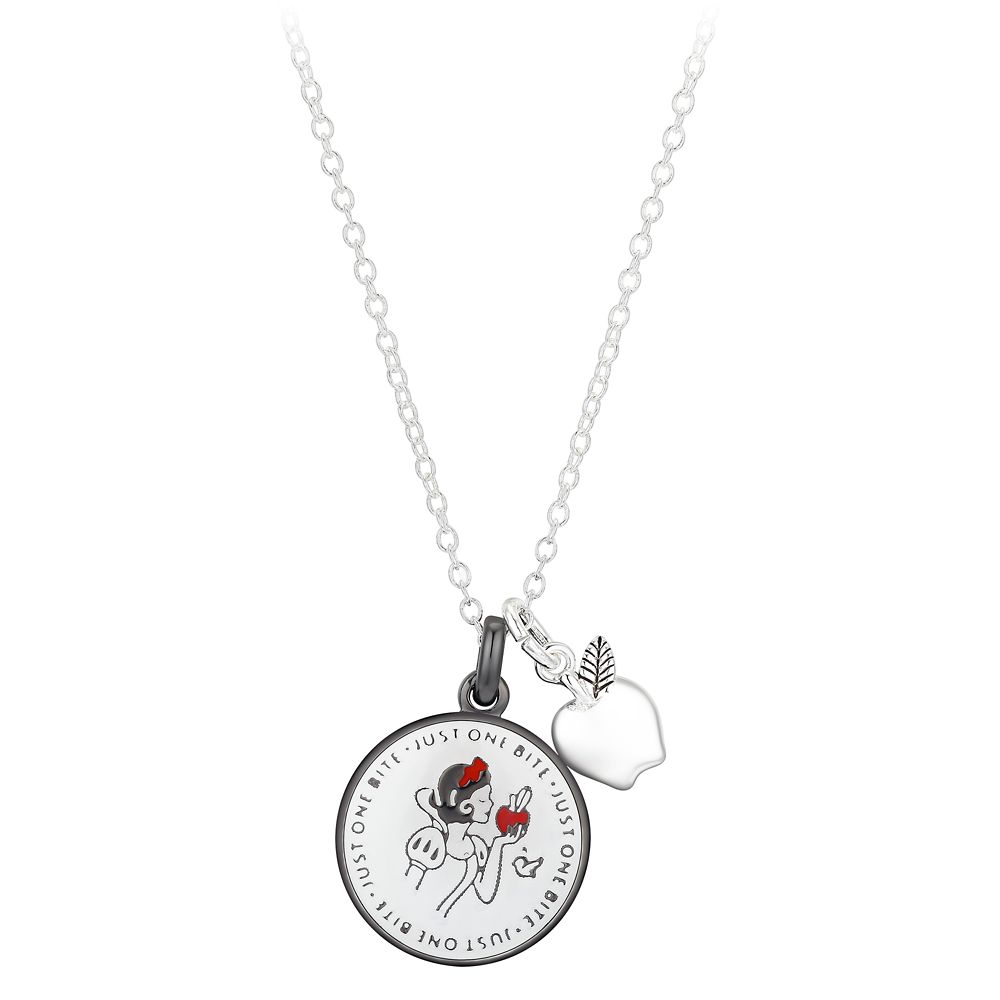It's hard to resist this Snow White Necklace featuring a tempting apple. Inspired by Disney's first full length animated classic, one pendant shows the original Disney Princess contemplating ''Just one bite'' while a second is the alluring fruit.