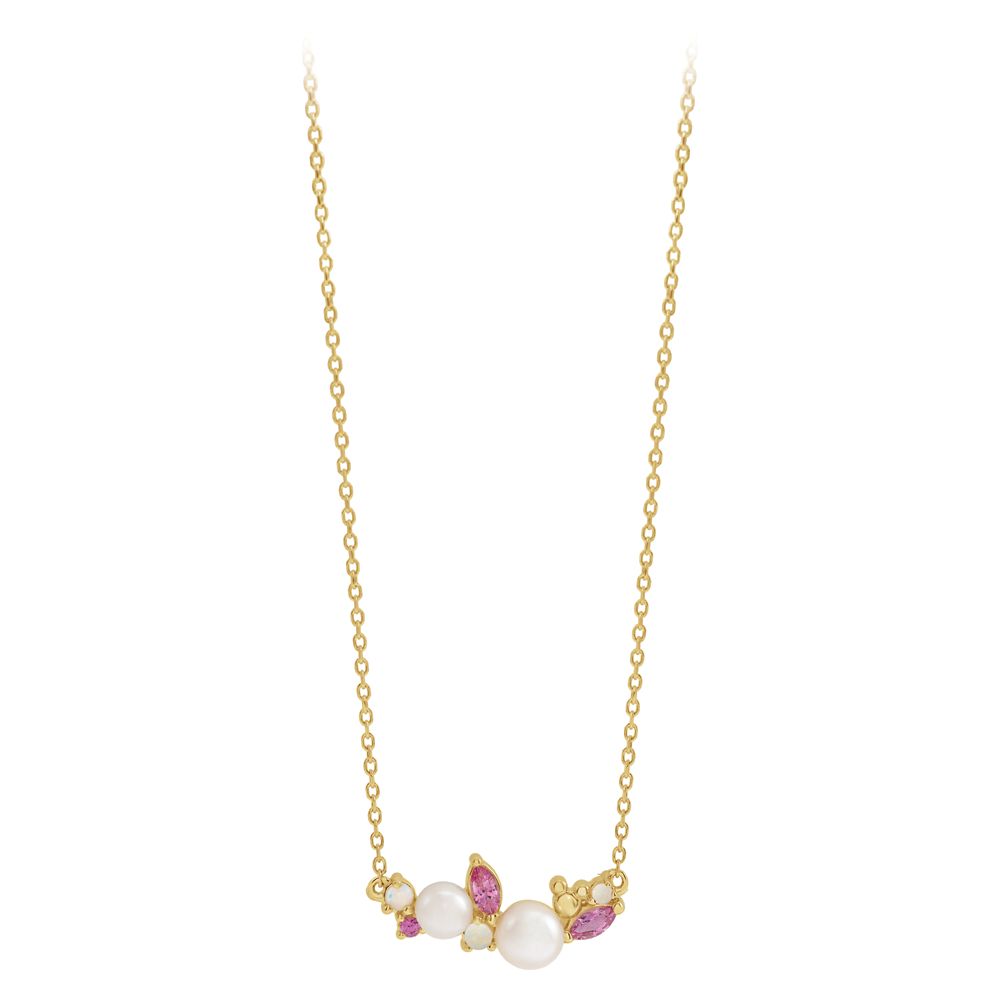 Complete your wedding jewelry suite with this dazzling 14K yellow gold cluster necklace. Created in celebration of the 30th anniversary of Disney's Fairy Tale Weddings Collection, a small Mickey icon is chicly nestled among the white pearls, opals and pink sapphires for a stunning piece filled with a fairytale charm.