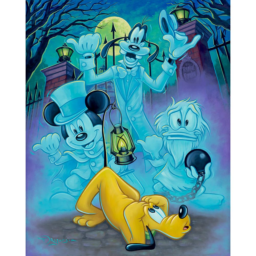 Mickey, Goofy and Donald assume the roles of the three Hitchhiking Ghosts from The Haunted Mansion attraction in this spectral image by Tim Rogerson. Pluto joins Ezra, Phineas and Gus in this limited edition print that comes gallery wrapped on canvas and ready to haunt your own mansion!.