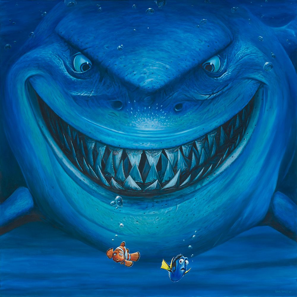 The terrifyingly toothy smile of the great white shark Bruce looms over the frightened fishy friends Marlin and Dory in this amusing work by Craig Skaggs. Inspired by the memorable scene in Finding Nemo where the pair first encounter the leader of the Fish-Friendly Sharks support group, ''Hello!'' is available as this limited edition giclée print that comes gallery wrapped on canvas and ready to hang in your home.
