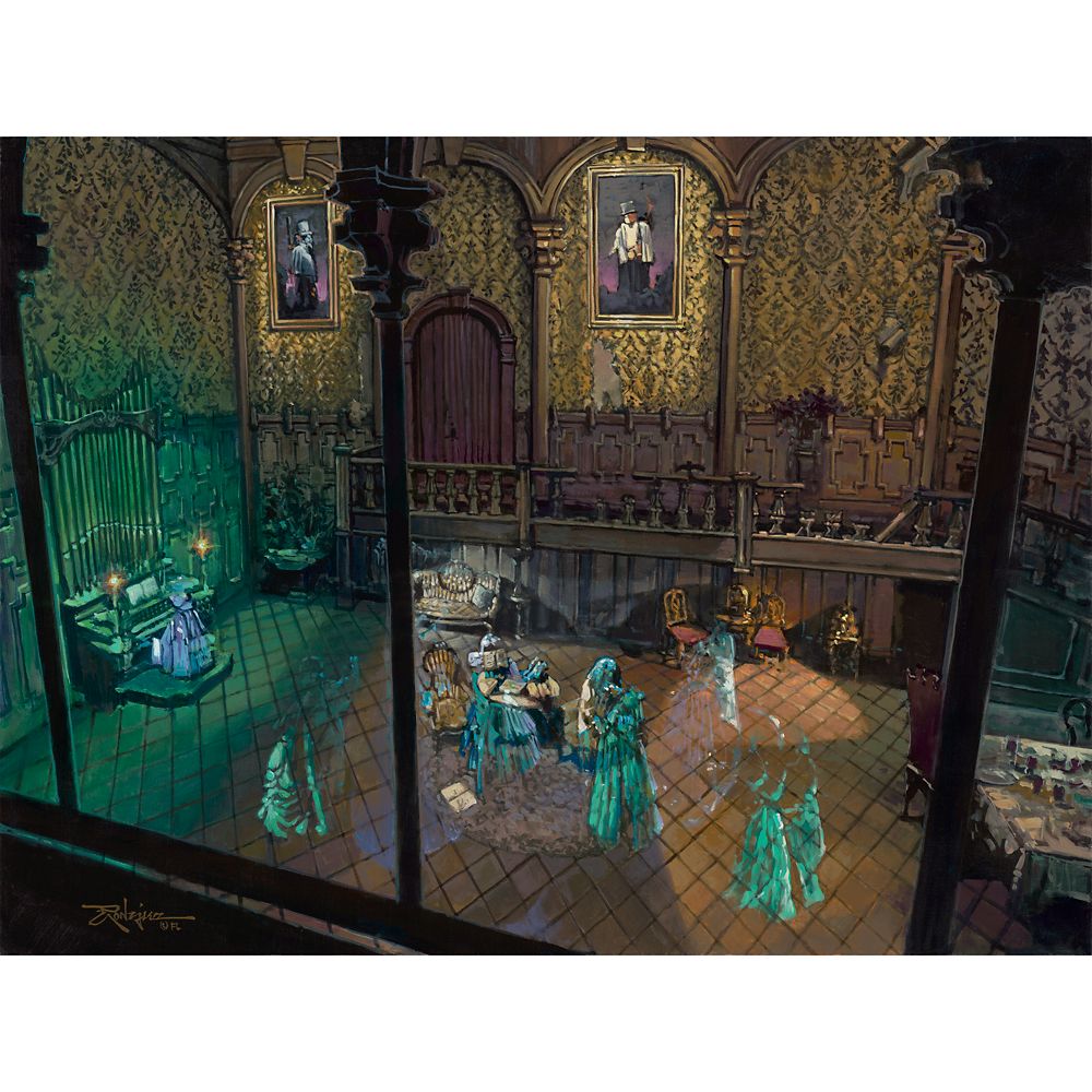 Turn your very own abode into the Grand Ballroom of The Haunted Mansion with ''Foolish Mortals'' by Rodel Gonzalez. The limited edition gallery wrapped canvas shows the immortal scene where happy haunts enjoy a swinging wake in the Disney Parks attraction. Ready to hang without a frame, it is sure to turn your living room into a favorite resting place while it stirs up instant ''sympathetic vibrations.'' Who knows who all will materialize to admire it?.