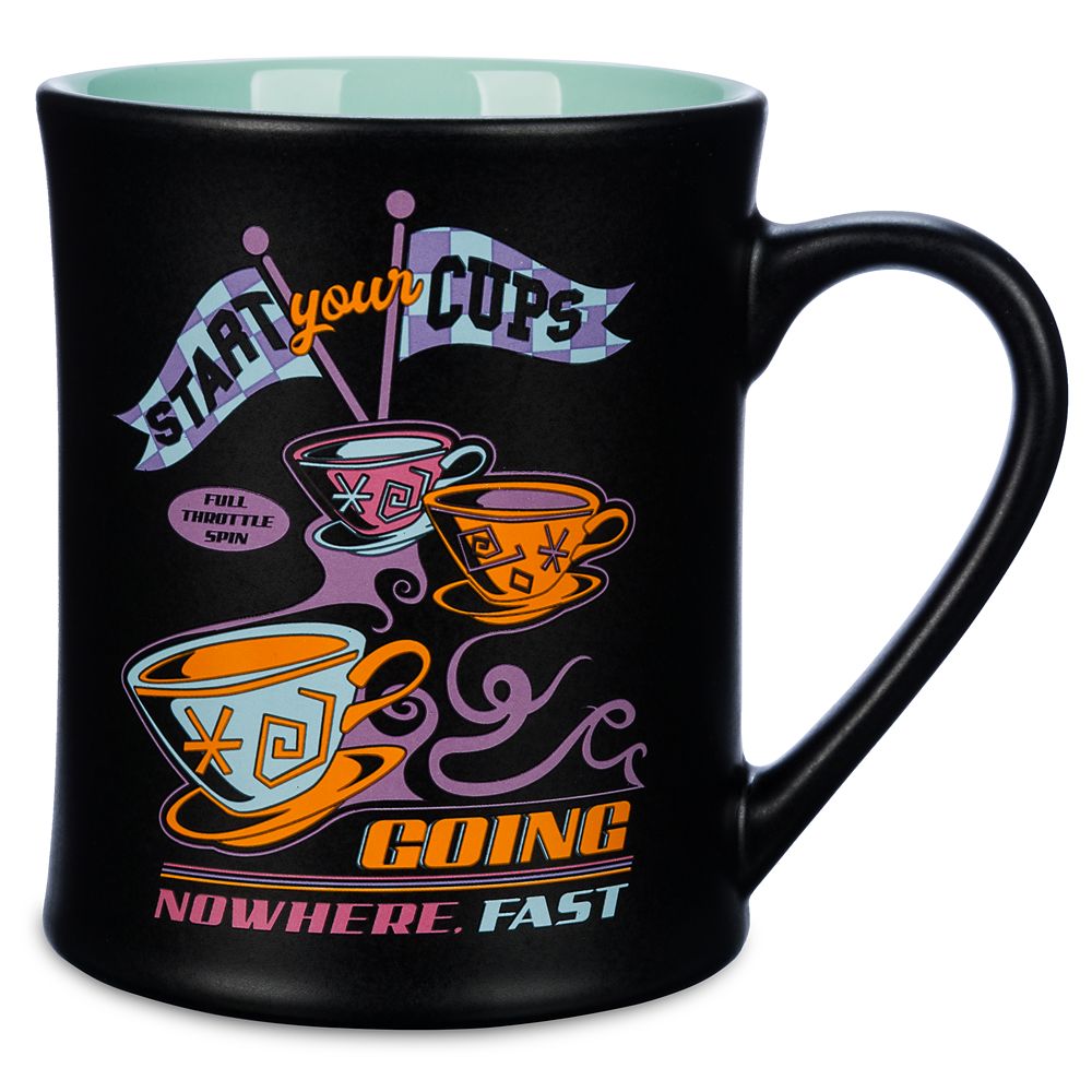 Get your day off to a racing start with this mug inspired by the dizzying Mad Tea Party attraction at the Disney Parks. Three of the colorful cups are pictured along with three speedy slogans including ''Full throttle spin.'' It's a great way to stir memories of past visits!.