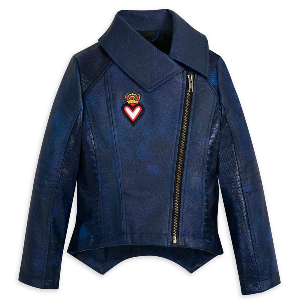 They'll rise to any occasion in this simulated leather jacket inspired by Disney's Descendants 4: The Rise of Red. The allover embossed snakeskin texture and the bluish tint capture the royal rebel attitude in style. Accented with a heart appliqué on the front and screened Princess Red and Chloe Charming icons on the back, it will be the crowning glory of any outfit.
