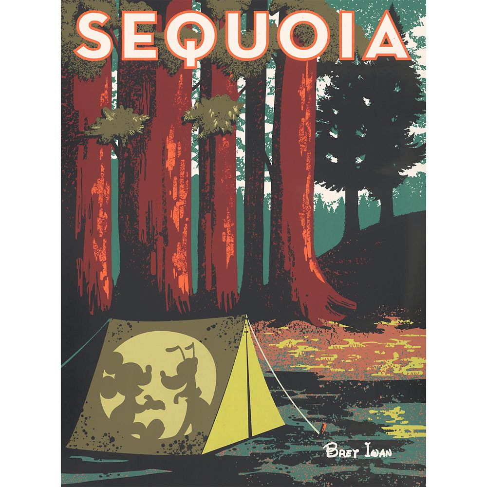 Mickey and Pluto are silhouetted in their tent, pitched among the towering redwoods of Sequoia National Park in this scenic work by Bret Iwan. A popular illustrator and actor, Iwan has been the voice of Mickey Mouse since 2009. Inspired by vintage travel posters, this limited edition giclée canvas artwork is gallery wrapped and ready to hang so you can start dreaming of your next (or first) excursion to the spectacular California park.
