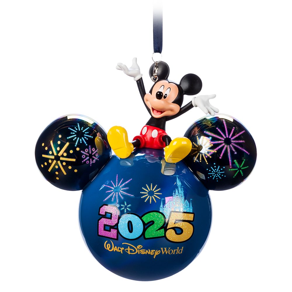 The magic will hang around awhile with this merry mouse icon glass ball ornament topped by a sculpted Mickey figure plus 2025 logo, a sparkling souvenir of your Walt Disney World dream vacation.