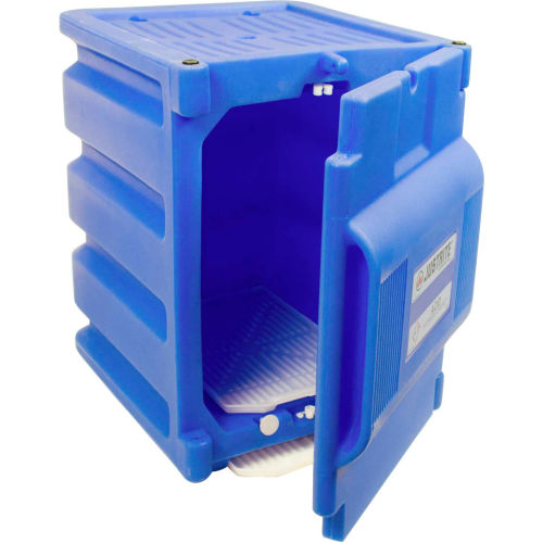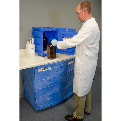 Justrite Polyethylene Acid Corrosive Countertop Cabinet This polyethylene plastic acid corrosive cabinet features a padlockable manual close door which has hinges on either side. Plastic safety cabinet is made with blue, corrosion resistant polyethylene. Acid corrosive cabinet sits countertops for convenient, compact storage. Stores up to two 4 liter bottles. Inside polyethylene tray catches leaks and additional pullout tray serves as a work surface. Includes a limited warranty of 1 year.