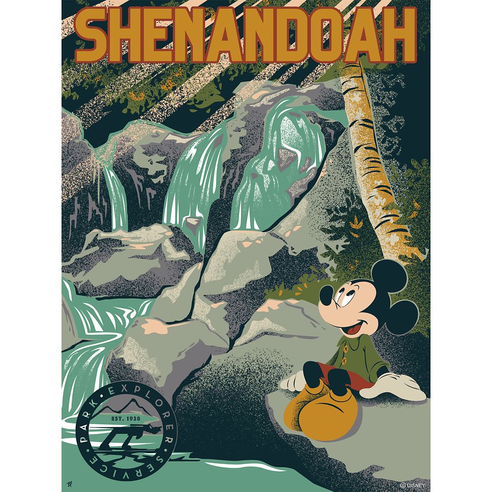 Mickey Mouse is pictured sitting at the base of a cascading waterfall in Virginia's stunning Shenadoah Park in this work by artist Bret Iwan. With its design resembling a vintage-style travel poster, complete with its Park Explorer Service logo, this limited edition print on canvas comes gallery wrapped and ready to hang in your home.