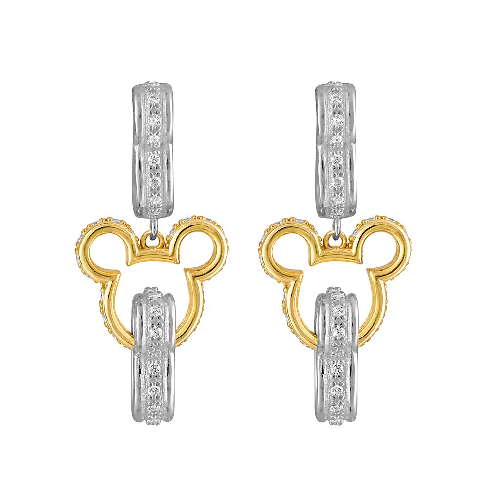 Mickey is all-ears for fine fashion with these sterling silver drop earrings by Rebecca Hook, studded with sparkling handset cubic zirconia. Featuring three mouse icons, linked together on each earring, plus 18k gold finish on center icon, this elegant jewelry is sure to lend your look a touch of Disney magic!.