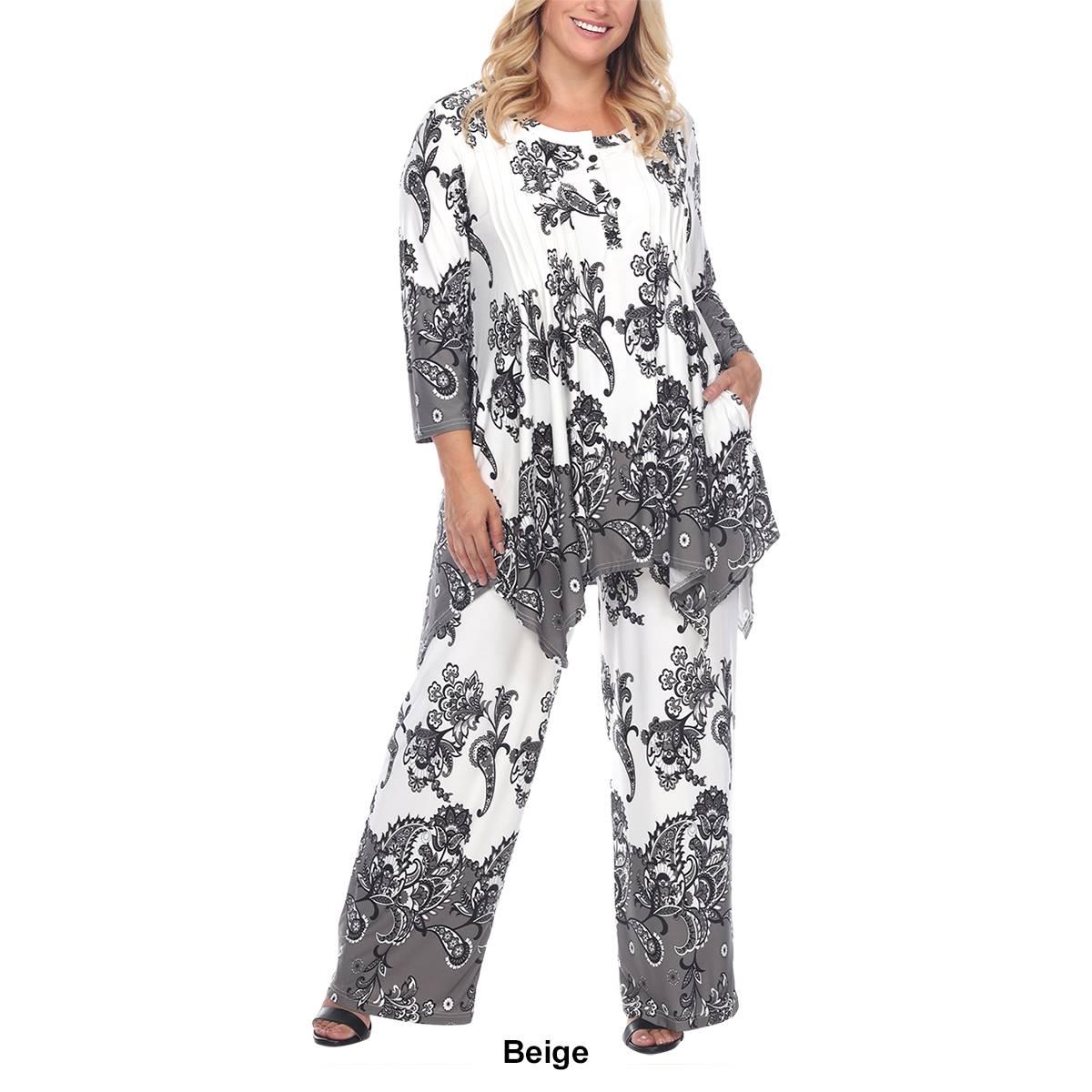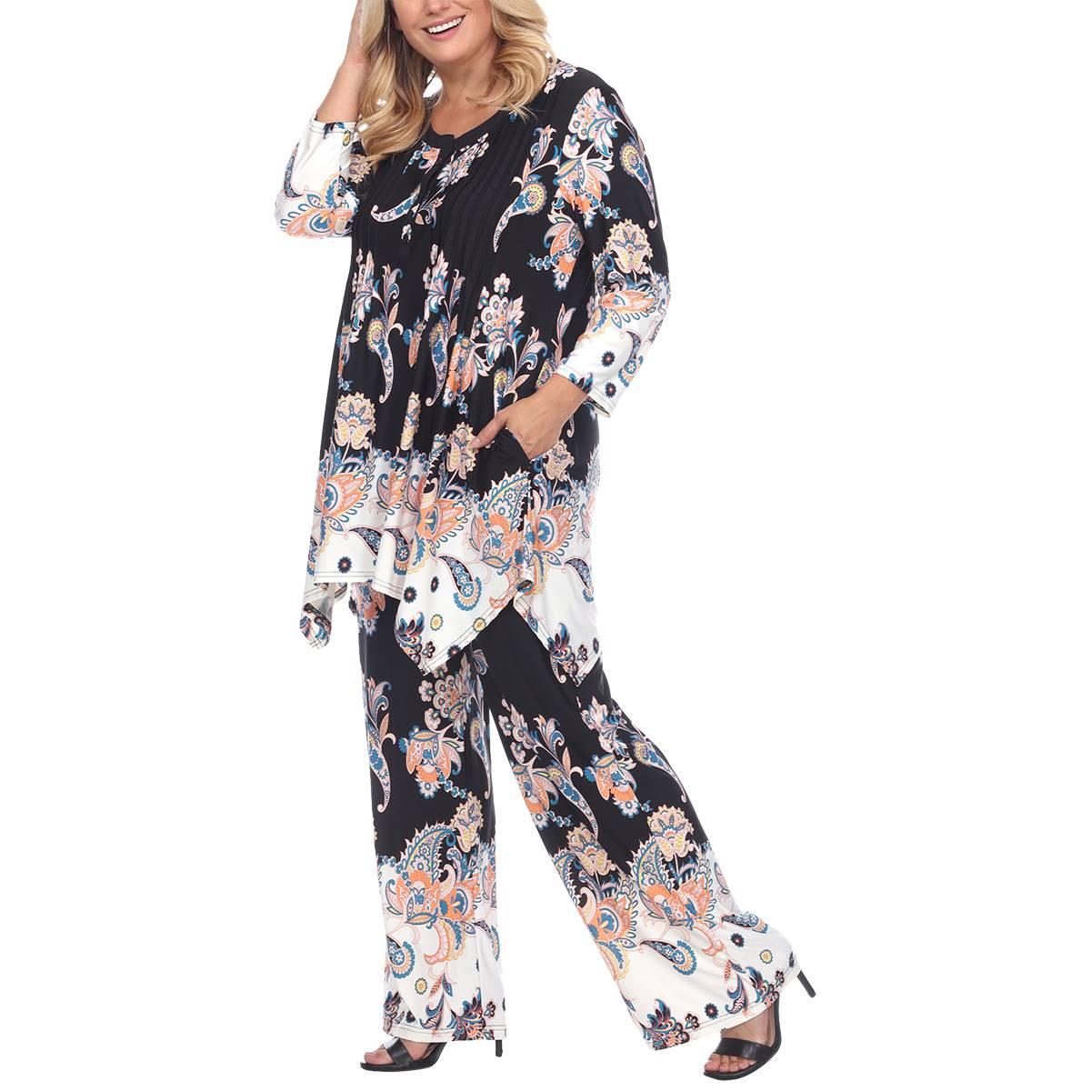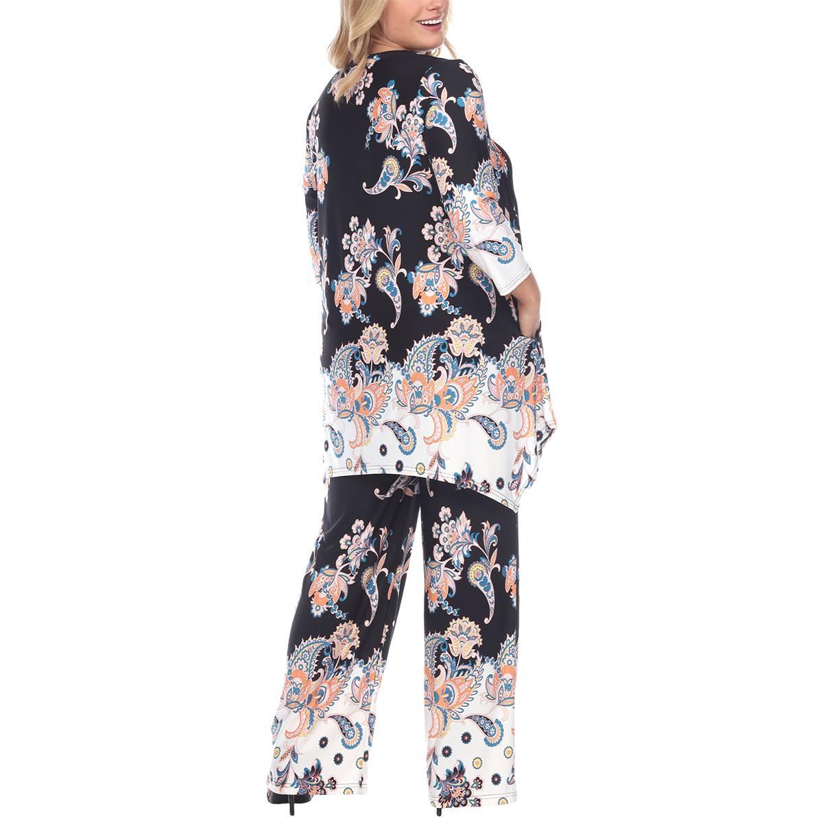 Stay casual and confident in these Plus Size White Mark palazzo pants and top set are made out of premium quality stretchy knit for a most flattering fit. Featuring a floral paisley print head to toe, scoop neck with button details, and three-quarter length sleeves. This set can be dressed up with heels or worn casually with flats.