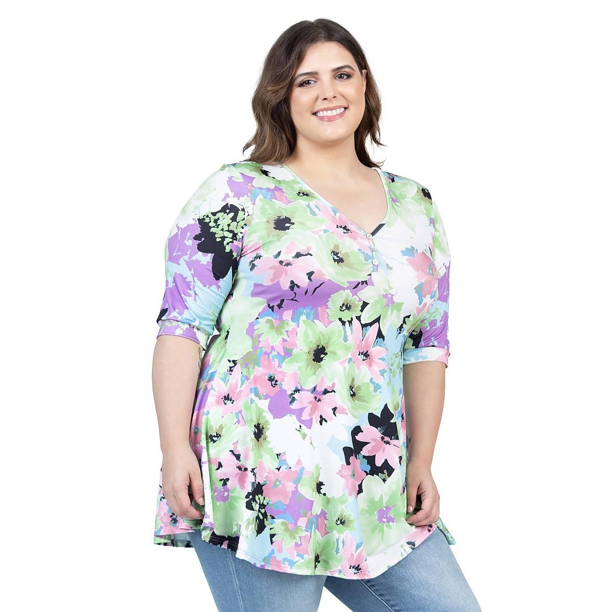 Brighten up your wardrobe with the Plus Size 24/7 Comfort Apparel floral elbow sleeve v-neck top. This effortlessly chic piece combines style and comfort, featuring a delicately designed pastel color floral print that embodies the season. The Henley v-neck and elbow-length sleeves add a touch of casual sophistication, while the relaxed fit and hip-length silhouette create a flattering and comfortable look. Crafted for versatility, this short sleeve top effortlessly pairs with leggings, making it a go-to choice for casual outings or relaxing at home.