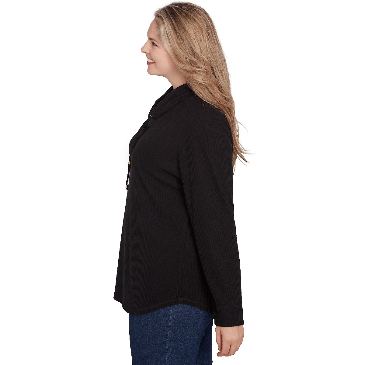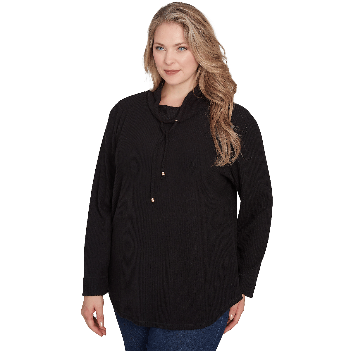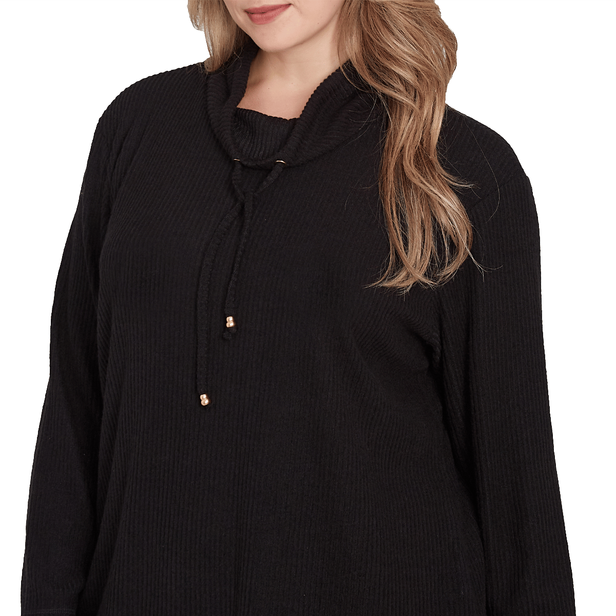 Collection: Red-Y To Shine Pattern: Solid Sleeve Length: Long Sleeve Neck: Cowl Neck Adjustable drawcord tie-neck Curved hemline Cool iron.
