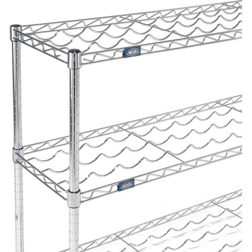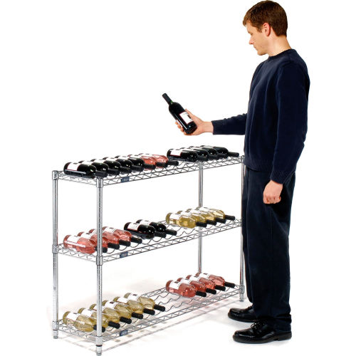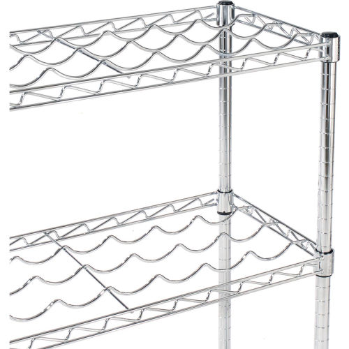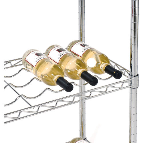 Wine Bottle Rack - Wire Shelving Wine Bottle Racks are an attractive and safe way to display and store wine bottles. Each bottle is securely cradled by heavy gauge wire to prevent movement. Adjustable shelves allow storage of many different sizes of bottles. Our open wire construction permits air to circulate around the bottles for an even temperature. The 36" wide shelves accommodate 9 bottles and the wide shelves accommodate 13 bottles. Each shelf level holds up to 100 lbs. Posts include bottom Leveling Feet and top Post Caps. For added protection, place a 4" ledge along the rear of the shelf. The electroplated nickel-chrome finish is durable, chip resistant and attractive for use in retail display. The use of 188735 Foot Plate is recommended for additional stability.