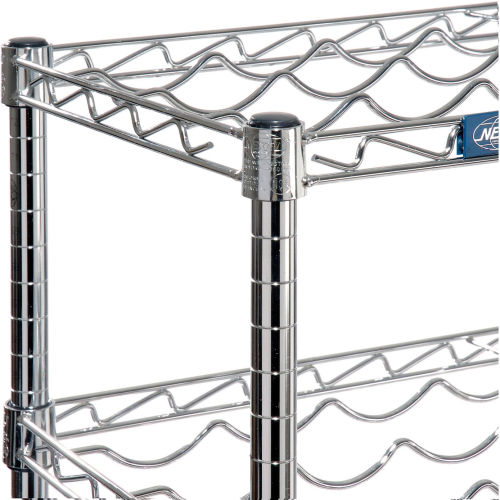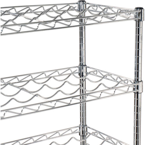 Wine Bottle Rack - Wire Shelving Wine Bottle Racks are an attractive and safe way to display and store wine bottles. Each bottle is securely cradled by heavy gauge wire to prevent movement. Adjustable shelves allow storage of many different sizes of bottles. Our open wire construction permits air to circulate around the bottles for an even temperature. The 36" wide shelves accommodate 9 bottles and the wide shelves accommodate 13 bottles. Each shelf level holds up to 100 lbs. Posts include bottom Leveling Feet and top Post Caps. For added protection, place a 4" ledge along the rear of the shelf. The electroplated nickel-chrome finish is durable, chip resistant and attractive for use in retail display. The use of 188735 Foot Plate is recommended for additional stability.