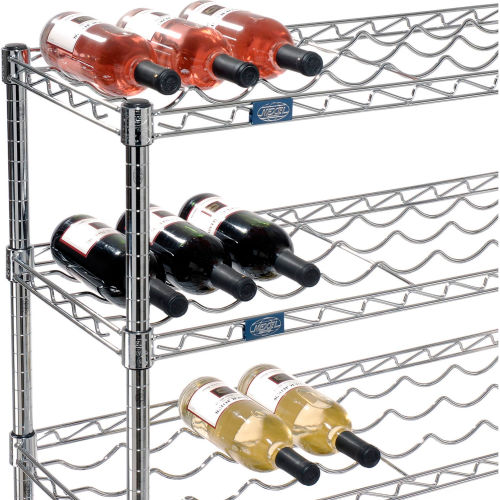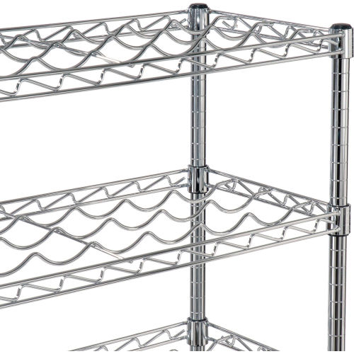 Wine Bottle Rack - Wire Shelving Wine Bottle Racks are an attractive and safe way to display and store wine bottles. Each bottle is securely cradled by heavy gauge wire to prevent movement. Adjustable shelves allow storage of many different sizes of bottles. Our open wire construction permits air to circulate around the bottles for an even temperature. The 36" wide shelves accommodate 9 bottles and the wide shelves accommodate 13 bottles. Each shelf level holds up to 100 lbs. Posts include bottom Leveling Feet and top Post Caps. For added protection, place a 4" ledge along the rear of the shelf. The electroplated nickel-chrome finish is durable, chip resistant and attractive for use in retail display. The use of 188735 Foot Plate is recommended for additional stability.