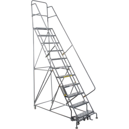 11 STEP HEAVY DUTY STEEL ROLLING LADDER Industrial Quality at an Economical Price Ideal for warehouse, stockroom, office and maintenance areas. 1-1/16" heavy-duty construction, 7" deep steps and rubber-tipped feet for stability and safety. 42" high handrails. Lock works by stepping on bottom step to raise casters; rubber feet grip floor. Depress brake release to roll ladder. Powder coat finish. Meets OSHA requirements. GRIP STRUT Note: Cal-OSHA Kit model 640250 must be ordered at time of purchase if shipping to the state of California in order to be OSHA compliant.font color ="red".