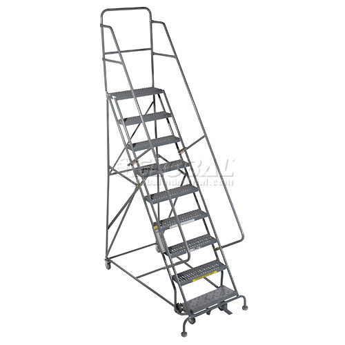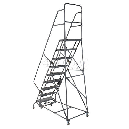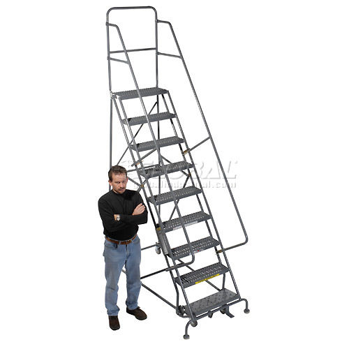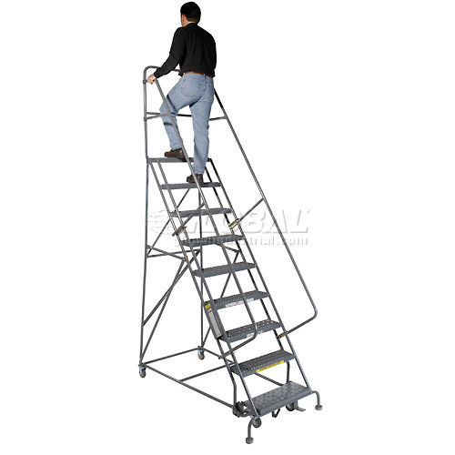 9 STEP HEAVY DUTY STEEL ROLLING LADDER Industrial Quality at an Economical Price Ideal for warehouse, stockroom, office and maintenance areas. 1-1/16" heavy-duty construction, 7" deep steps and rubber-tipped feet for stability and safety. 42" high handrails. Lock works by stepping on bottom step to raise casters; rubber feet grip floor. Depress brake release to roll ladder. Powder coat finish. Meets OSHA requirements. GRIP STRUT Note: Cal-OSHA Kit model 640248 must be ordered at time of purchase if shipping to the state of California in order to be OSHA compliant.font color ="red".