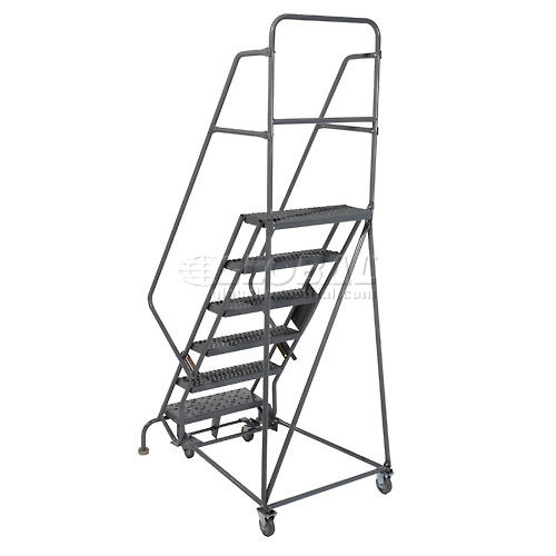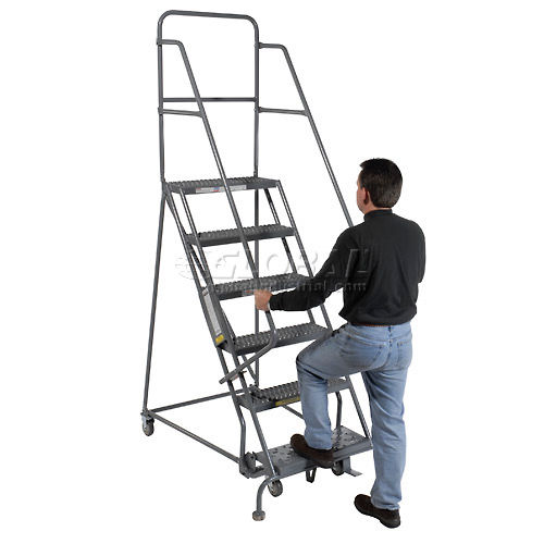 6 STEP HEAVY DUTY STEEL ROLLING LADDER Industrial Quality at an Economical Price Ideal for warehouse, stockroom, office and maintenance areas. 1-1/16" heavy-duty construction, 7" deep steps and rubber-tipped feet for stability and safety. 42" high handrails. Lock works by stepping on bottom step to raise casters; rubber feet grip floor. Depress brake release to roll ladder. Powder coat finish. Meets OSHA requirements. GRIP STRUT Note: Cal-OSHA Kit model 606697 must be ordered at time of purchase if shipping to the state of California in order to be OSHA compliant.font color ="red".