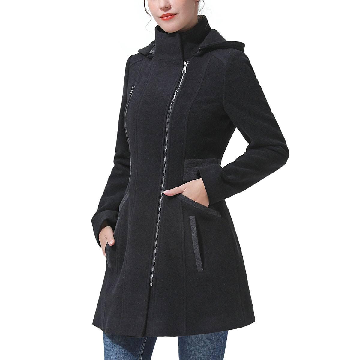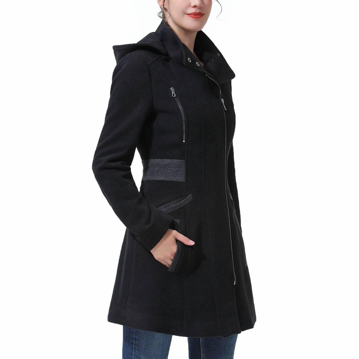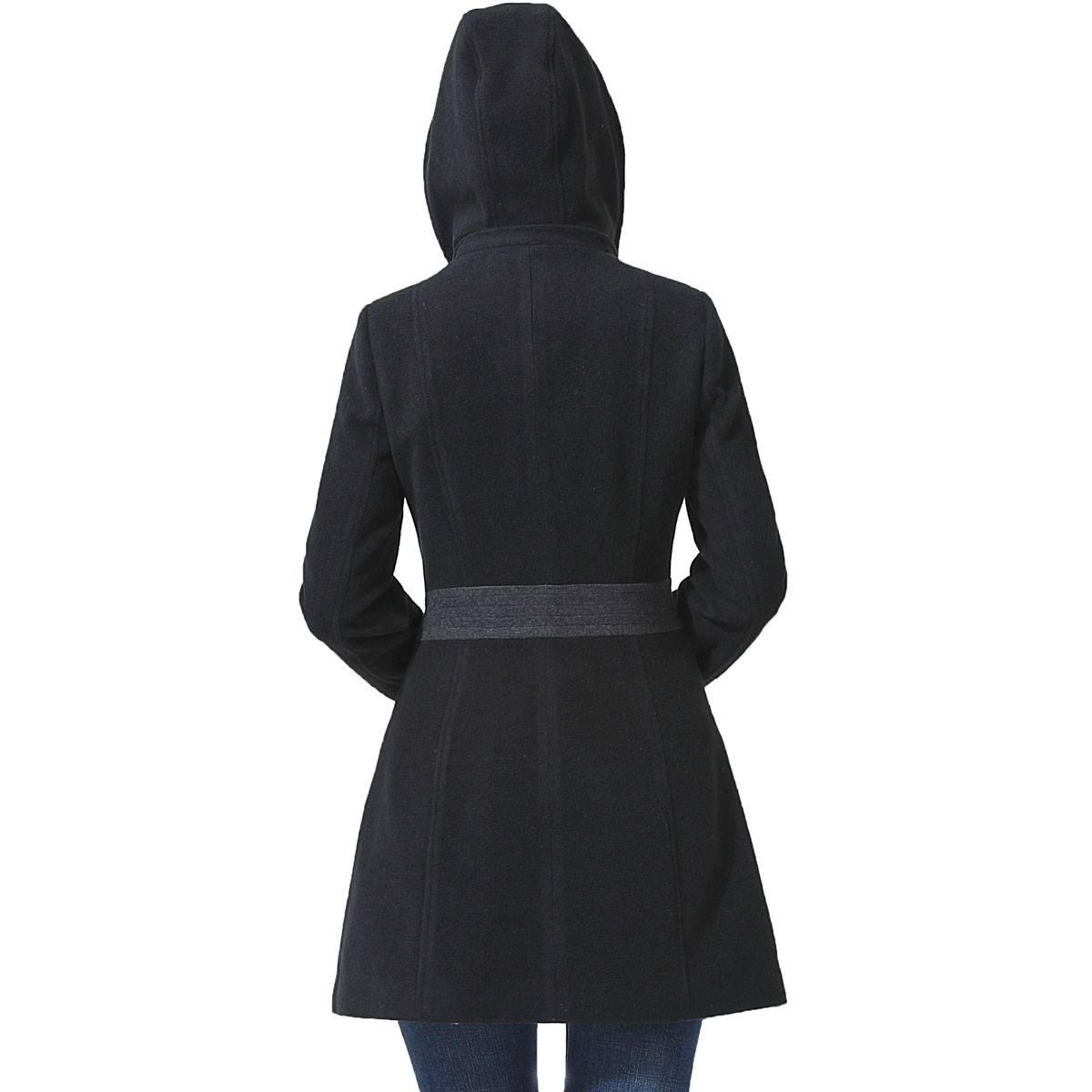 This Womens BGSD hooded color block wool coat adds a dash of flare to any attire. Featuring a removable hood and convertible stand collar, detailed seam work on the waistband beautifully refines and compliments the waistline. Four hip pockets, one chest pocket, and two interior pockets provide plenty of pocket space. Body length: 34".