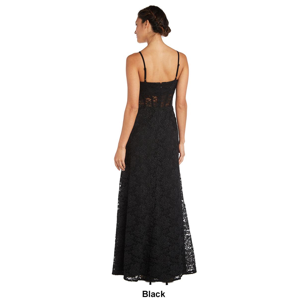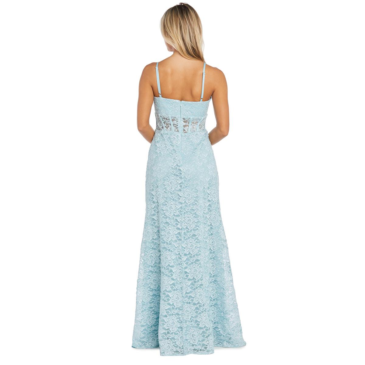 Sleeve Length: Sleeveless Neck: V-Neck Length: 61" Zip back closure Scalloped detail on neck High slit on hem Glitter detailed lace Corset bodice with illusion detailing.