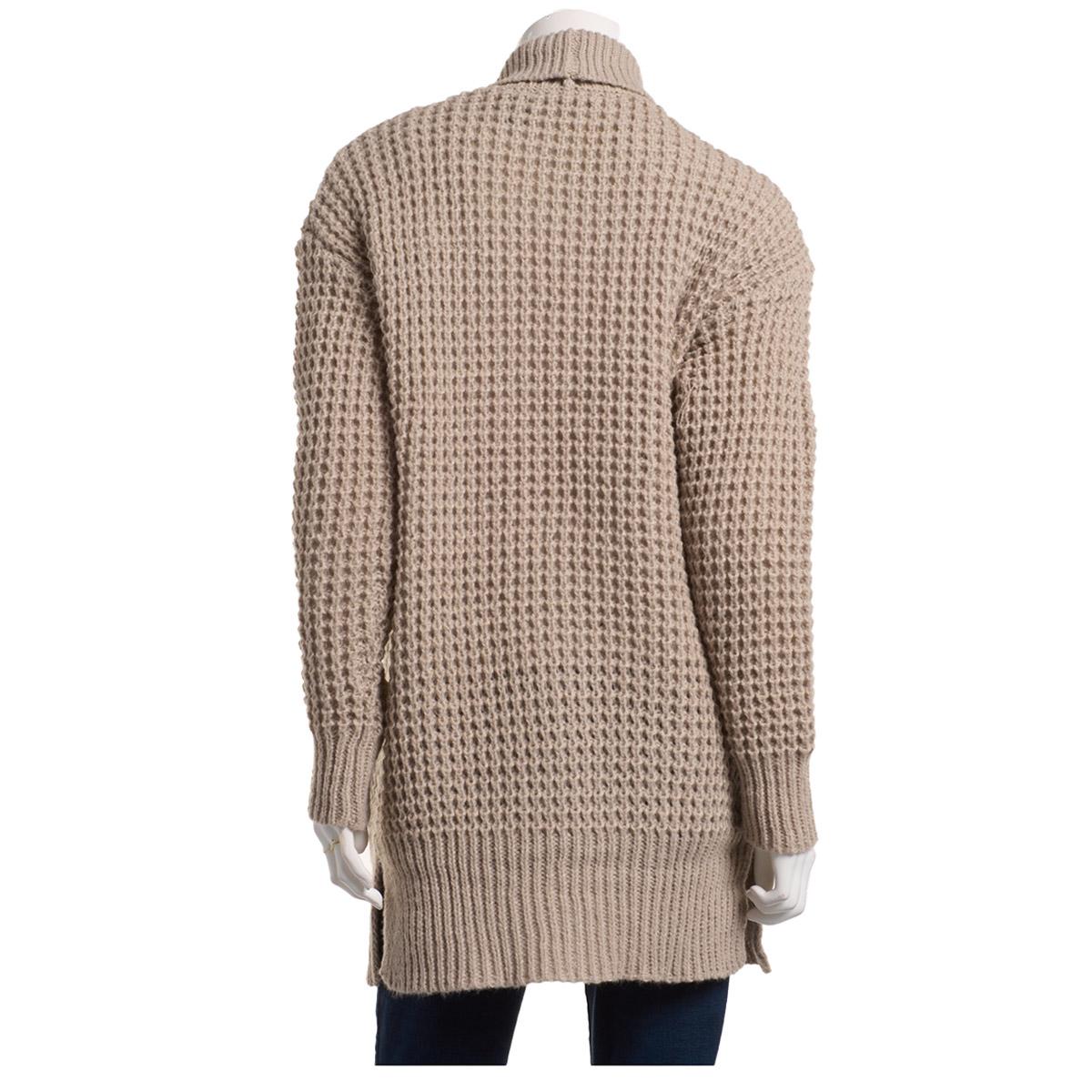 Pattern: Solid, Perforated Sleeve Length: Long Sleeve Center Back Length: 35" Draped lapel opening Open stitch construction 2x2 Rib-knit lapel & cuffs Side entry pockets Split side hems Straight hem Open front.