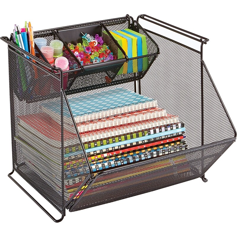 Safco Onyxstackable mesh storage bin has sturdy construction and stacks up to two high to modify your storage space. Bin feature a detachable accessory organizer that can mount on the front or the back depending on your storage needs. Holds letter-size files. Stack up to two high. Overall dimensions: 11 3/4"H x 14"W x 15 1/2"D. Safco's Limited Lifetime Manufacturer's Warranty. Sturdy black. Detachable accessory organizer mounts on the front or back. Accommodates all necessary storage needs from office supplies to letter-size hanging file folders and everything in between. Safco Onyxstackable mesh storage bin holds all necessary storage needs from office supplies to letter-size hanging file folders and measures 11 3/4" x 14" x 15 1/4".