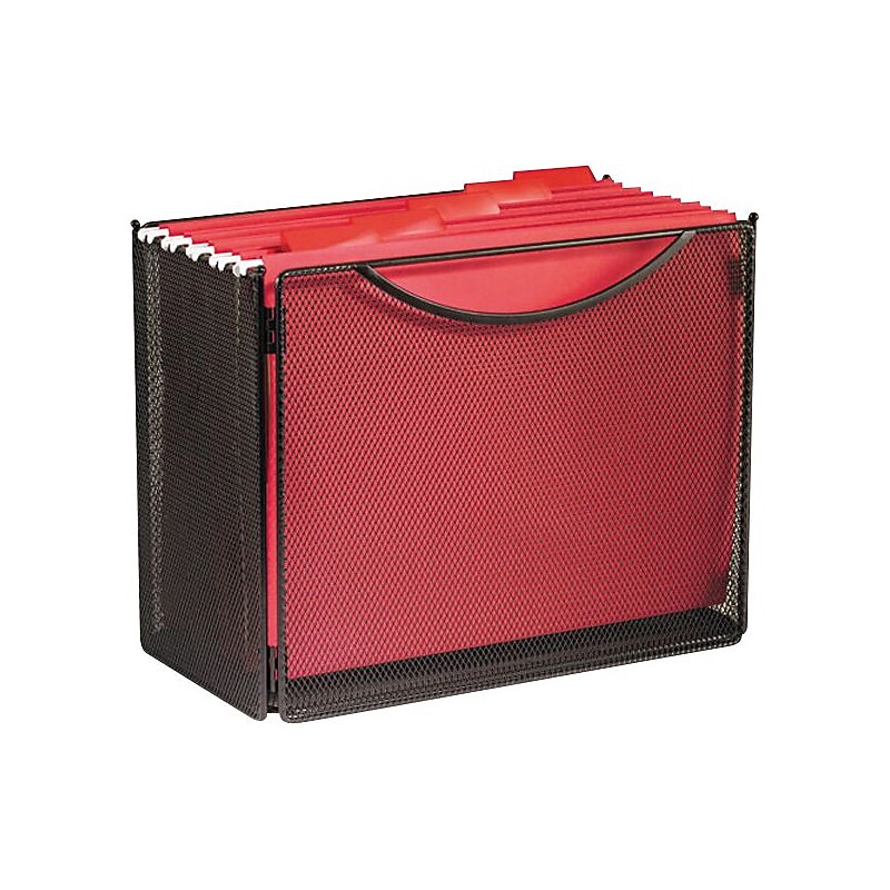 Safco Onyx Desktop Box File, 10"H x 12 1/2"W x 7"D. One compartment. Steel mesh construction. Portable file box with integrated handles add style to your filing. Open top for letter-sized hanging files. Easily collapses for storage when not in use. Collapsible, great for storing when not in use.