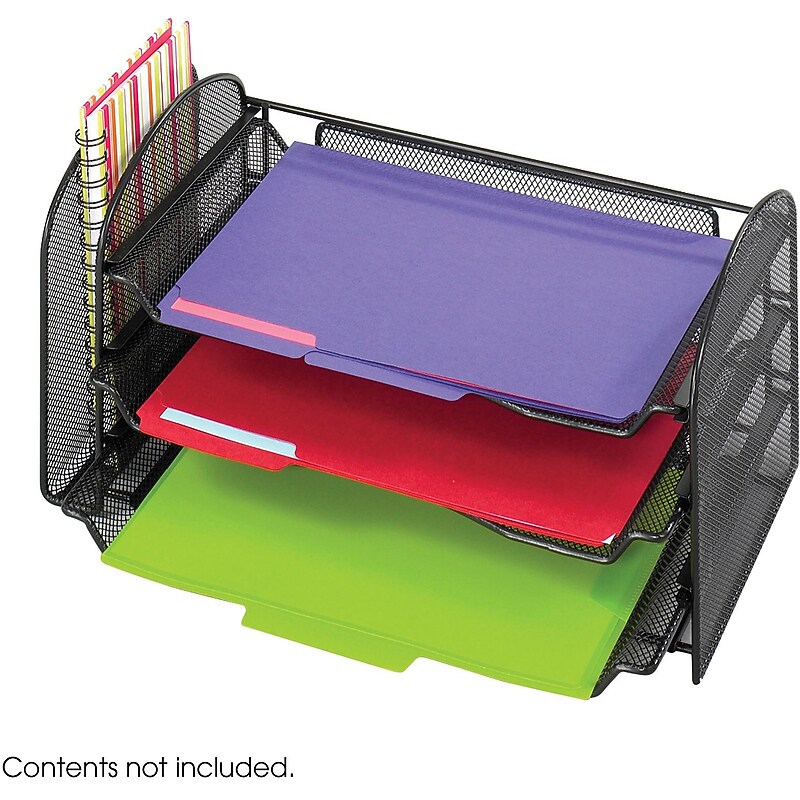 Safco Onyx One upright/three horizontal sections mesh desktop organizer color measures 8" x 16 1/4" x 9" is ideal for file organization. Organizer and is made of steel for added durability and strength. Capacity: 1. Dimensions: 8"(H) x 16 1/4"(W) x 9"(D). Material: Steel. For: File organization. Bottom tray may be removed and replaced with the mesh drawer organizer. Number of compartments: 4. One vertical section holds file folders and binders. Three horizontal sliding trays accommodate any letter size documents. Placement: Desktop. Weight: 4 lbs. Safco Onyx One upright/three horizontal sections mesh desktop organizer color has three horizontal sliding trays that accommodates any letter size documents.