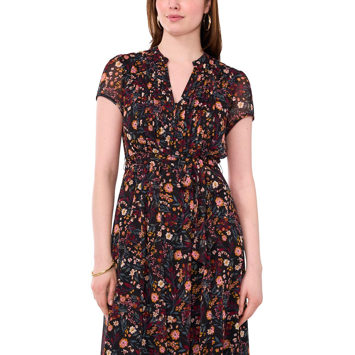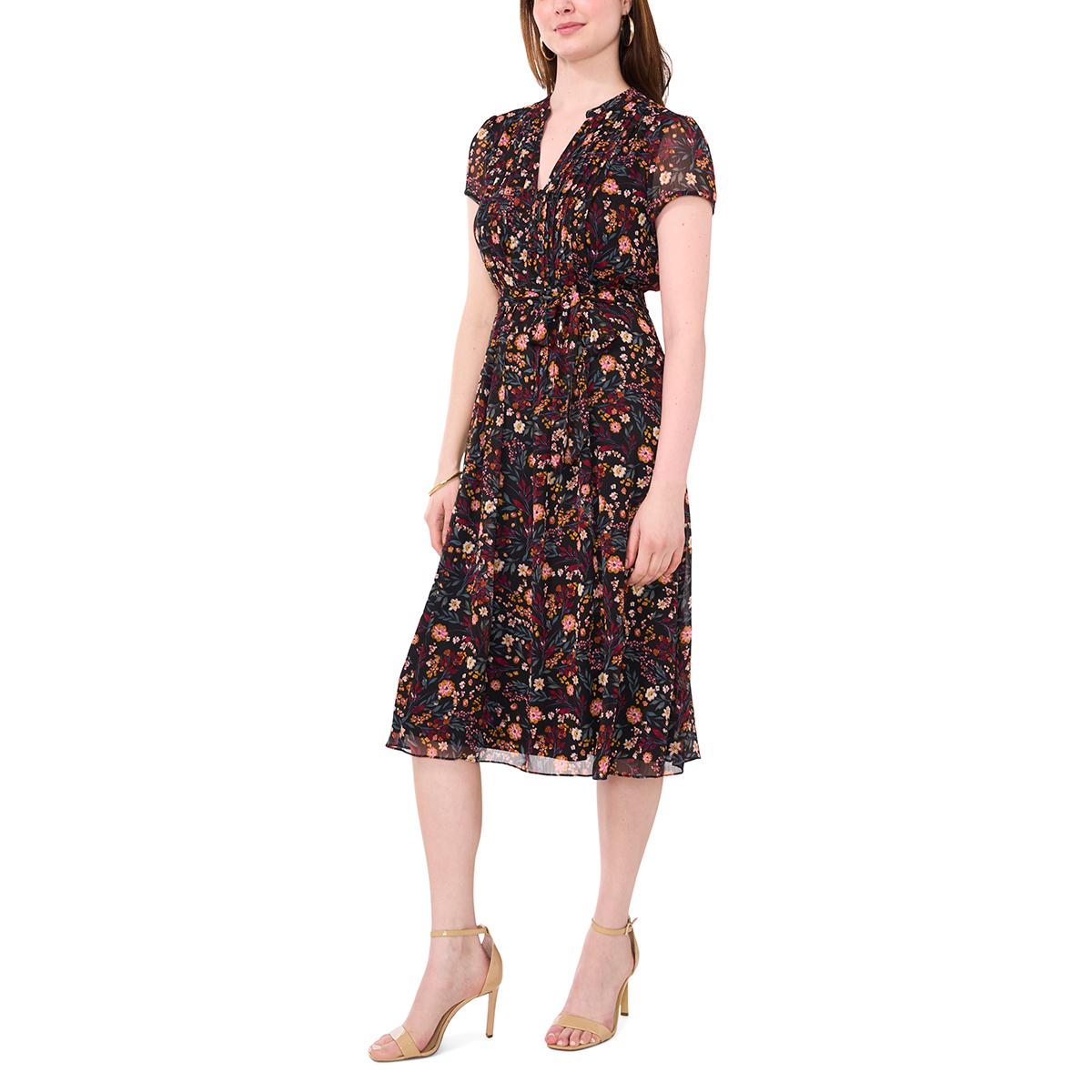 Womens MSK Short Sleeve Floral Vine Chiffon Pintuck Midi Dress