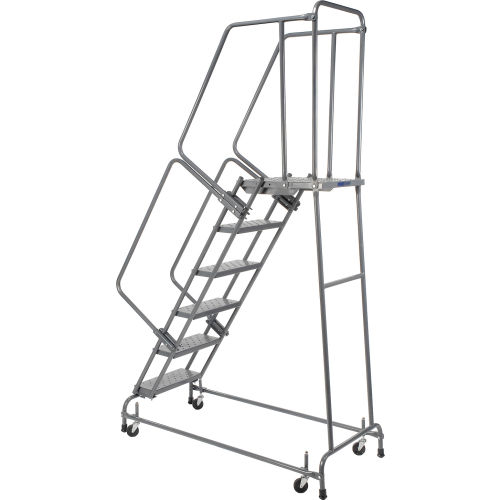 6 STEP INDUSTRIAL STEEL ROLLING LADDER Perfect for use in warehouse, stockroom and maintenance areas. Built to take heavy everyday use. Increase productivity quickly by taking the ladder where the work is. Fast, easy assembly. deep top step and handrail. Lock has spring loaded casters that retract when stepping on ladder; rubber feet grip floor. Ladder rolls freely after you step off. Note: Cal-OSHA Kit model 607403 must be ordered at time of purchase if shipping to the state of California in order to be OSHA compliant.font color ="red".