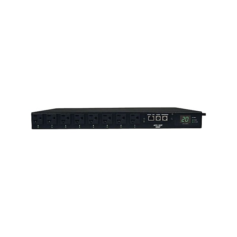 TRIPP LITE 5-15/20R 16 Outlet 20 A 100 - 127 V Switched Power Distribution Unit provides a redundant power option for single-corded network devices. The dual input cords support separate connection to PRIMARY and SECONDARY power sources. The ATS will normally maintain continuous output to all outlets as derived from the primary input cable. If the primary power source becomes unstable or fails altogether, the ATS will switch over to the secondary power source until the primary input is restored and stable. Switched PDU features include individually controllable output receptacles and built-in network interface. Super-fast switchover between primary and secondary power sources occurs within milliseconds. ATS functionality is supported by any two compatible AC power sources, regardless of phase angle, to support a variety of advanced redundant power networking applications. Enables fault tolerant hot-swappable UPS protection when used with a single UPS and fully redundant UPS protection when each cord is connected to a separate UPS system. In a two-UPS environment, the primary input cable must be supported by a full time sine wave UPS with zero transfer time. Tripp Lite SmartOnline series is highly recommended for use as the primary UPS in a two-UPS application. The ATS configurations utilizing separate mains circuits, backup generators and even separate utility power grid feeds are fully supported. On-board ATS processor constantly evaluates power quality on both input sources to prevent transfer to the secondary source when unavailable or of lower quality than the primary source. The front input LED's display primary or secondary power availability. Single phase NEMA 5-20P / NEMA L5-20P 12 ft 20 A 100 - 127 V input. 120 V 60 Hz output. 16 NEMA 5-15/20R outlet connector. 1U horizontal rack mount form factor. Package includes PDU with attached L5-20P input power cord, detachable C19 to NEMA L5-20P 12 ft/3. 6m secondary input cord, two NEMA L5-20R to NEMA 5-20P plug adapters, installable 1U mounting brackets, user manual with warranty information. Visual meter reports output power consumption in amps. ATS features provide redundant power for critical network equipment with a single input power cord. Switched PDU features enable programmable or real-time power control of individual outlets via built-in network interface. Advanced ATS configurations using separate mains circuits, backup generators and out of phase utility feeds are fully supported. 2-7 millisecond transfer time between primary and secondary inputs. Front panel LEDs confirm power availability on primary/secondary inputs and each output receptacle. ATS configurations enable hot-swappable UPS protection when used with a single UPS and redundant UPS protection when each input is connected to a separate UPS system. On-board processor evaluates power quality on both inputs to prevent transfer to the secondary source when unavailable or of lower quality than the primary source. Outlets are factory programmed for sequential turn-on at 250 millisecond intervals as the PDU is first energized. Typical applications: ATS PDU systems provide a redundant power option with individual outlet control for single-corded network devices. DHCP/Manual configuration support, supports HTTP, HTTPS, PowerAlert network management system, SMTP, SNMPv1, SNMPv2, Telnet, SSH, FTP, DHCP, BOOTP, NTP protocols. Certifications: Tested to UL 60950 (USA, Canada), Class A (Emissions), NOM (Mexico), RoHS complaint. 12. 2 lbs. 1 3/4"(H) x 17 1/2"(W) x 14 1/2"(D). 2 years limited warranty. TRIPP LITE 5-15/20R 16 Outlet 20 A 100 - 127 V Switched Power Distribution Unit's ATS features provide redundant power for critical network equipment with a single input power cord.