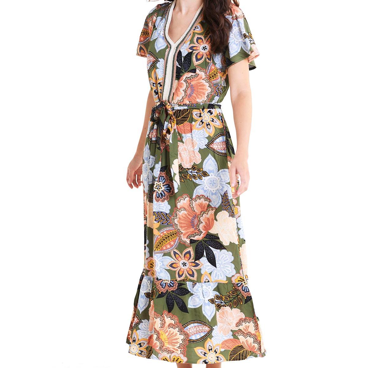 Pattern: Wild Floras Sleeve Length: Short Sleeve Neck: V-Neck Length: 50" Contrasting braided neckline detail Removeable sash-tie waist belt Flounce hemline Unlined.