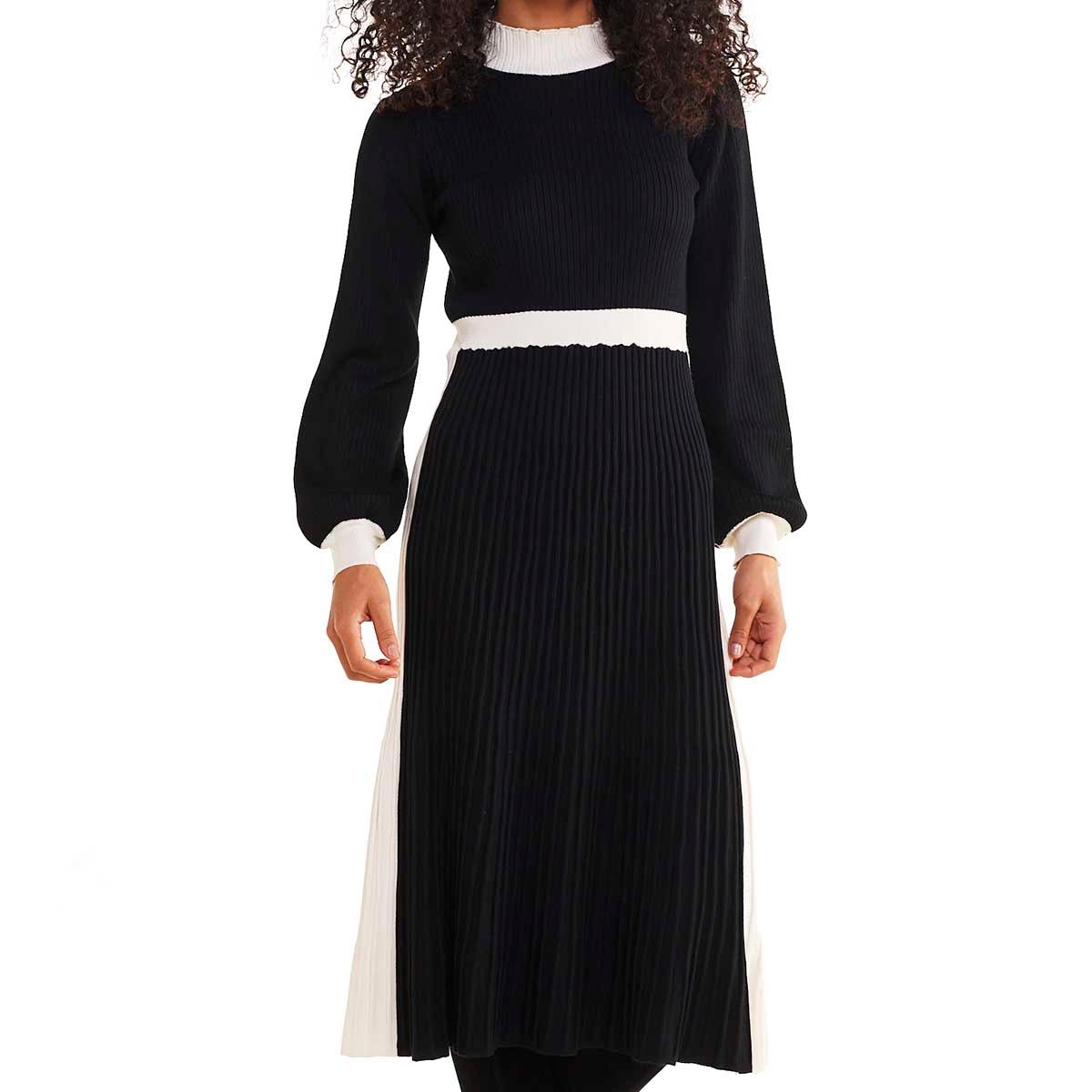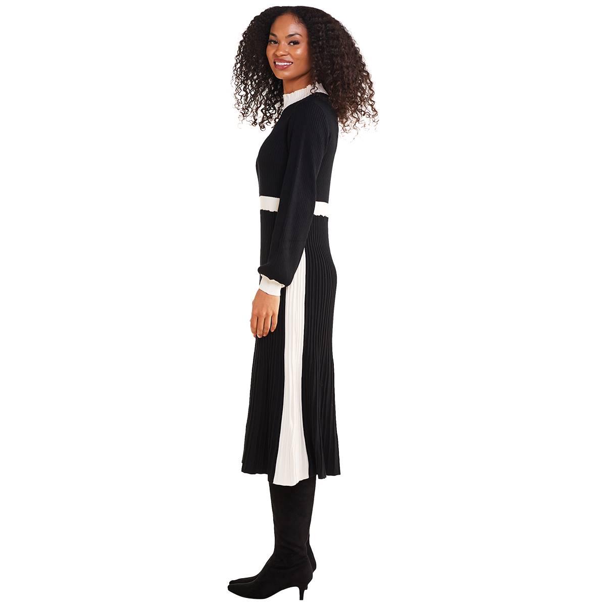 Pattern: Color Block Sleeve Length: Long Puff Sleeve Neck: Mock Neck Dress Length: 47" Banded cuffs & waistband Accordion pleated skirt Pull-on styling Linear hemline Low iron.