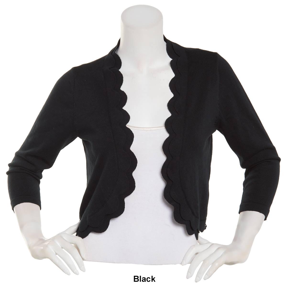 Layer your staples with ease and effortlessness with this Plus Size Nina Leonard 3/4 sleeve double scallop edge bolero shrug. You'll find yourself reaching for it again and again.