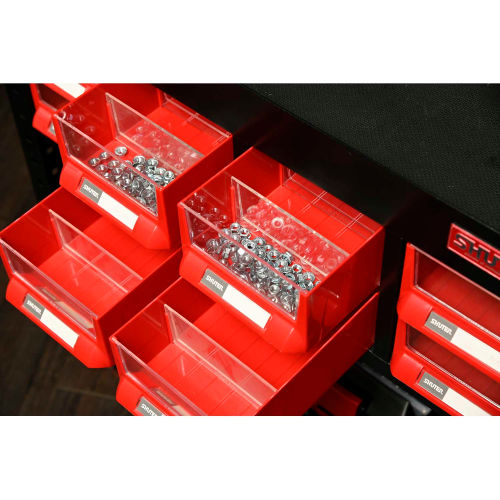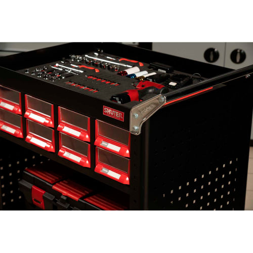 Shuter professional service cart designed for manufacturing, assembly and maintenance department applications. capacity with (8) bins that include a unique tilt out drawers. 4" Industrial polypropylene casters, 2 with brake to secure cart on uneven surfaces. Curved ergonomic steel integrated handle for easy grip to move cart enhances structural integrity of cart. Globally compatible square-hole pegboard side panels help keeping organized and tools handy with any peg/hook set (sold separately). Drawers and shelves fitted with a 3mm thick grease resistant, anti-corrosion, anti-slip pad to safely hold equipment. Fully adjustable 440lb capacity shelves can be attached to frames lip up or lip down along predrilled frame openings, provides tray or flat work surface at the height that suits your needs. Ships unassembled. This proudct has 1 Year Warranty.