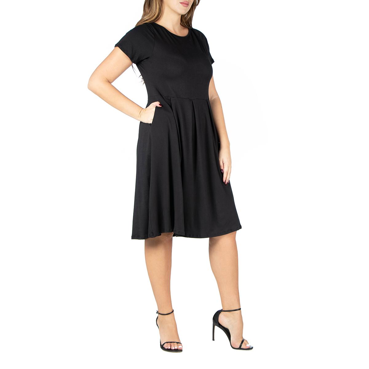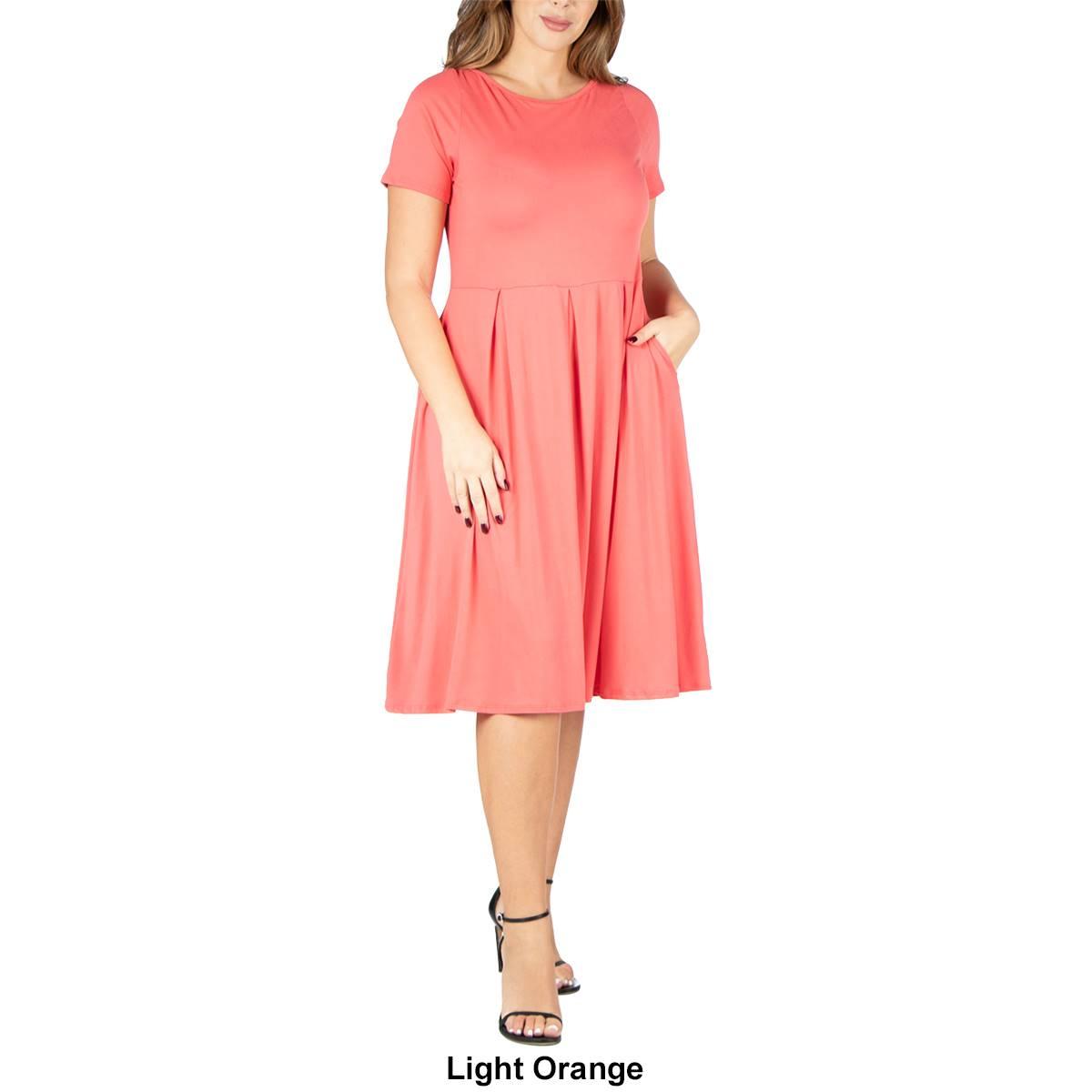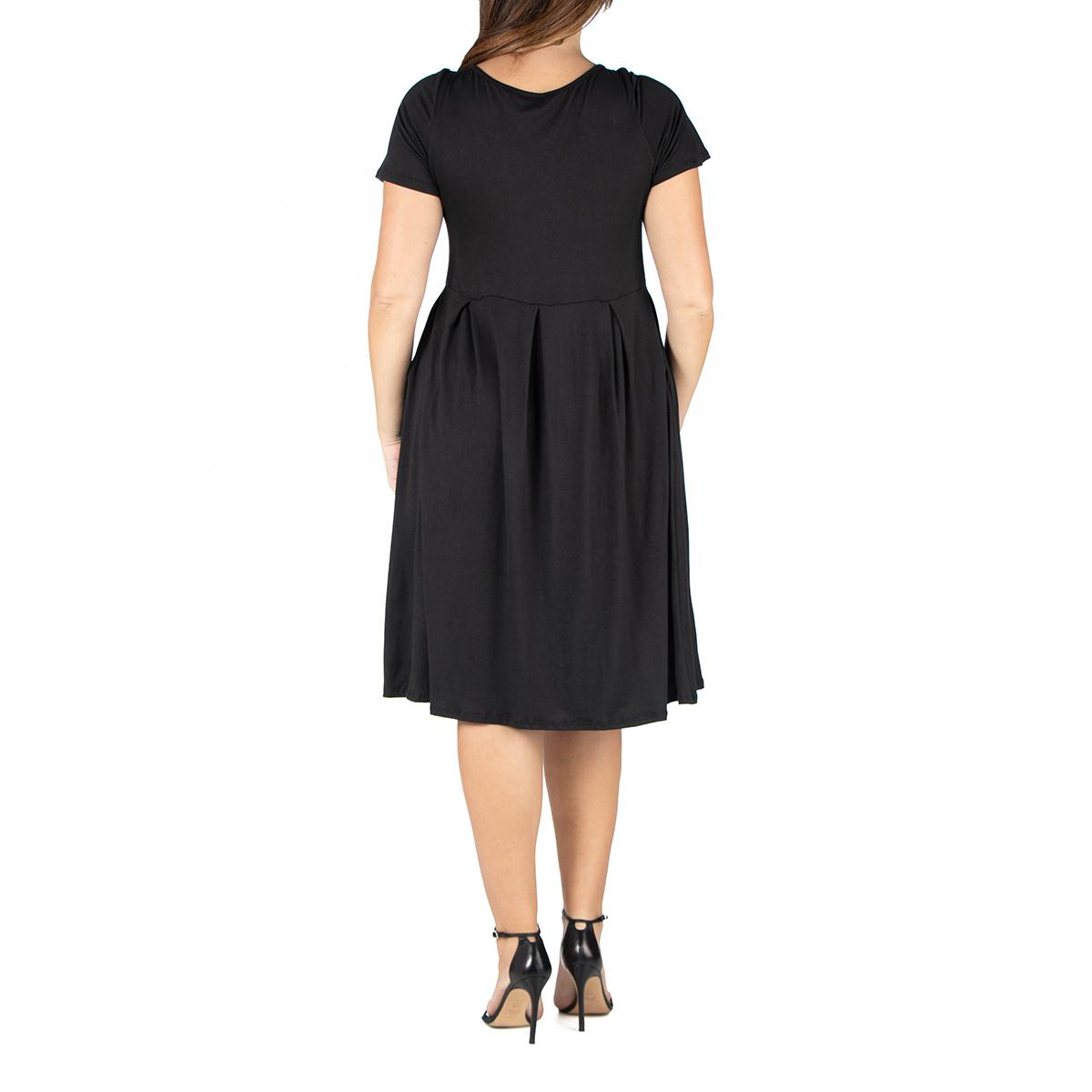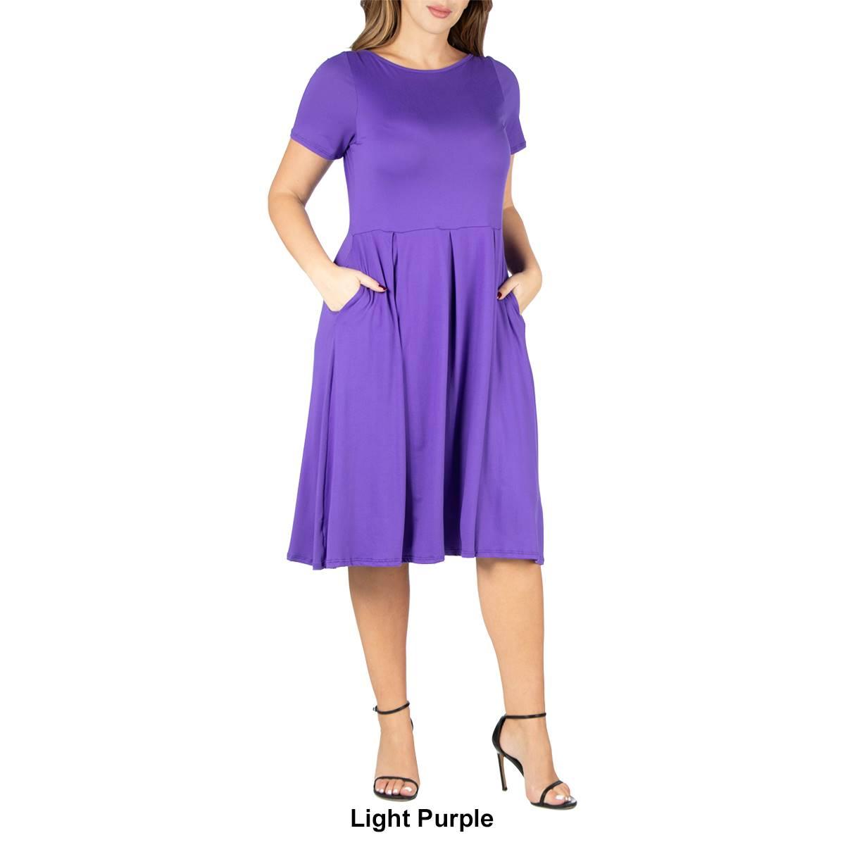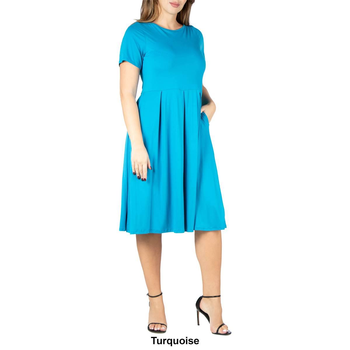 Perfectly polished this Plus Size 24/7 Comfort Apparel fit and flare dress is available in a variety of beautiful colors! This dress features pleating at the waist, pockets, a round neckline, and short sleeves. Pleated.