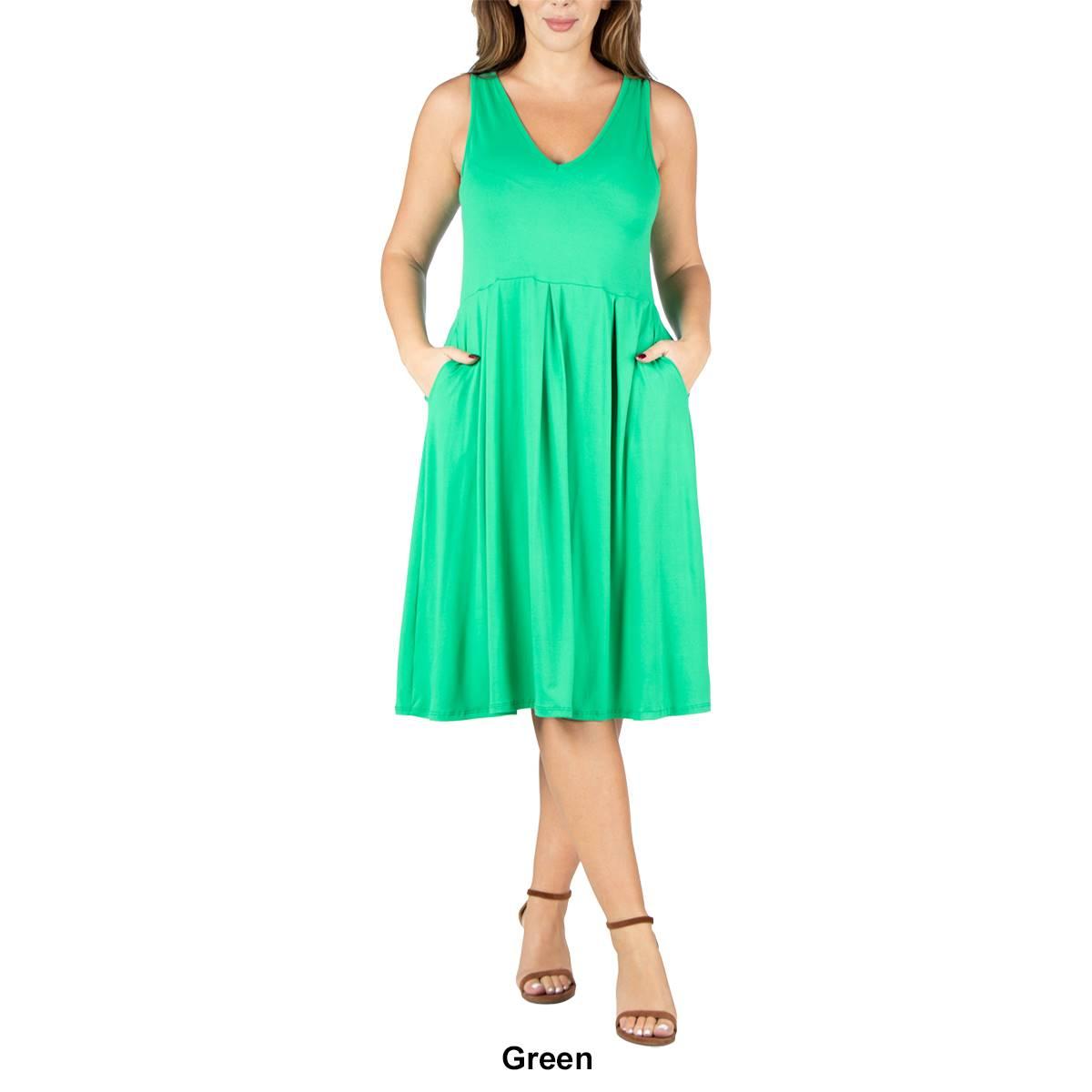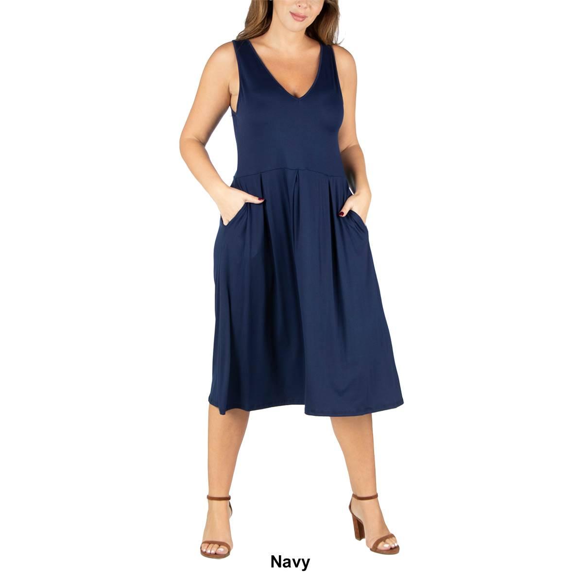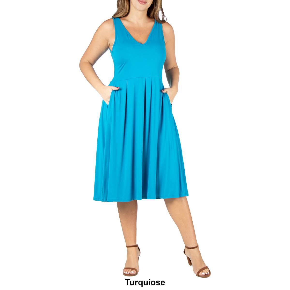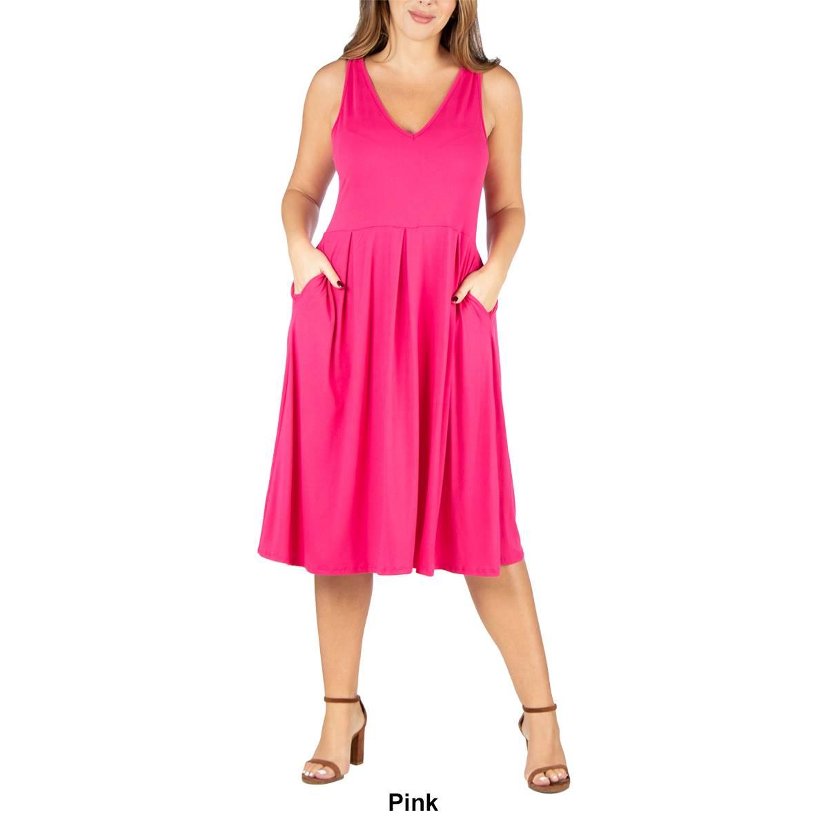 Retro and chic this Plus Size 24/7 Comfort Apparel shift pocket dress is a comfortable style for Summer. Available in a beautiful variety of colors this sleeveless dress features pleating at the waist, pockets, and a v-neck. Pleated.