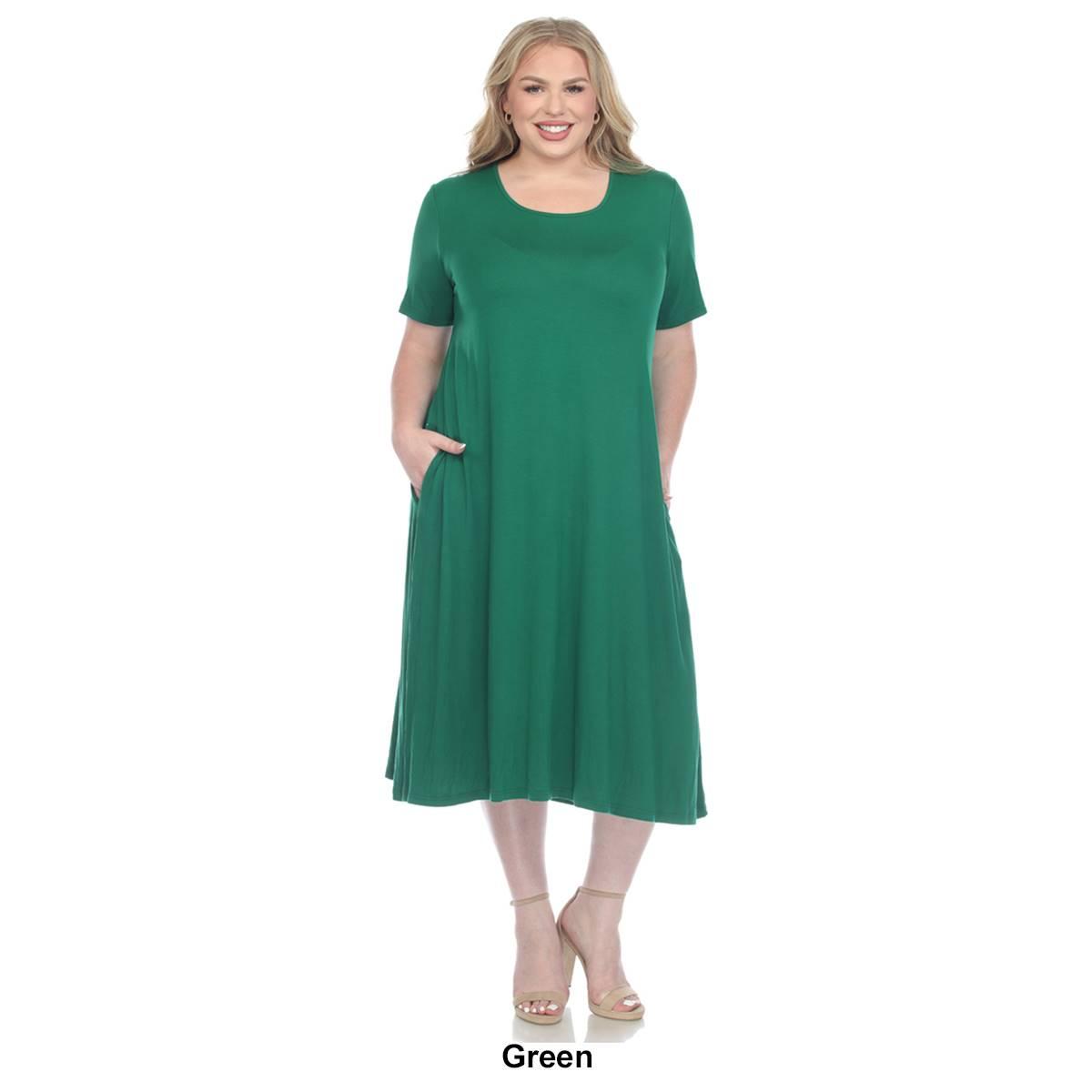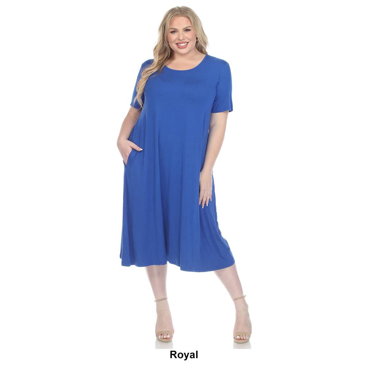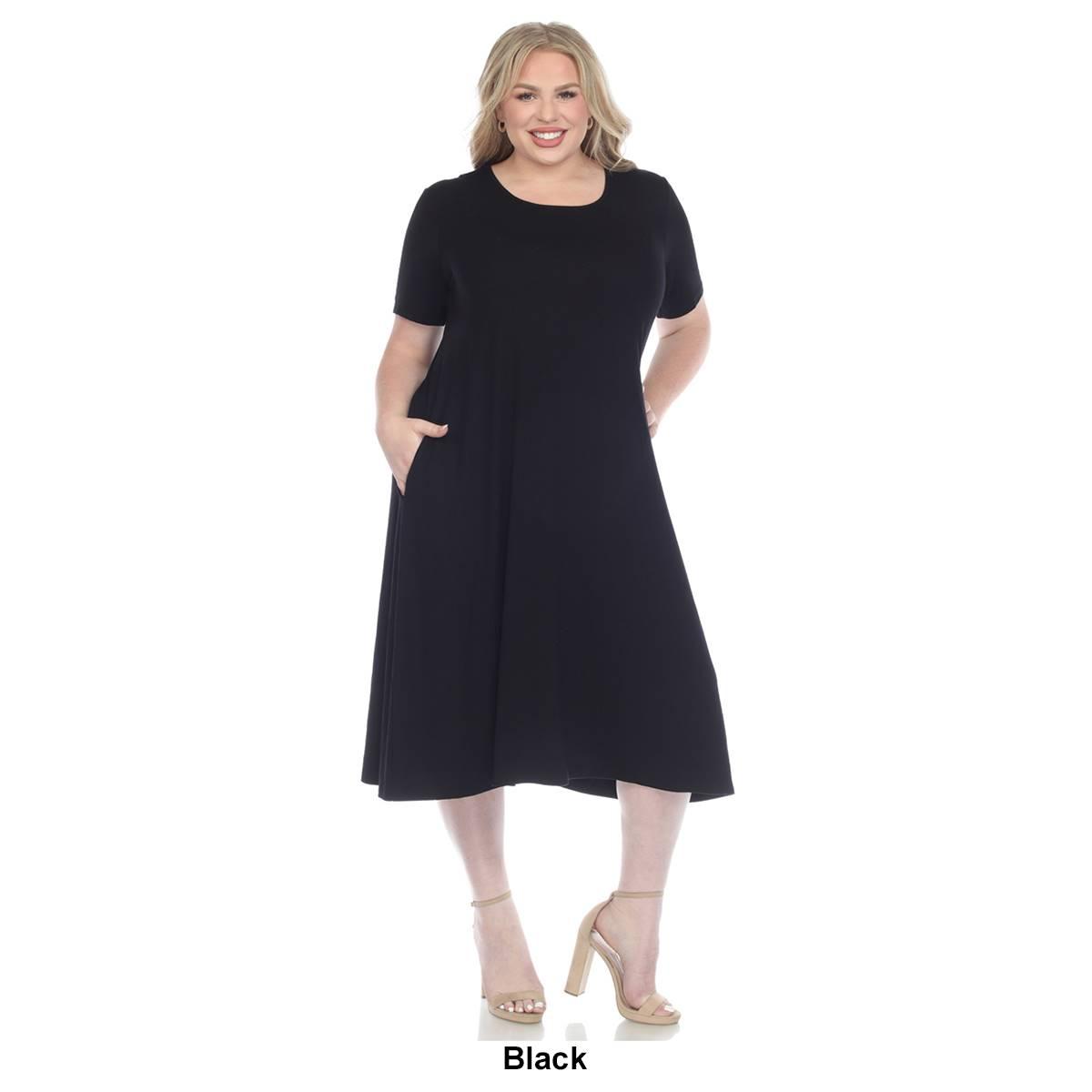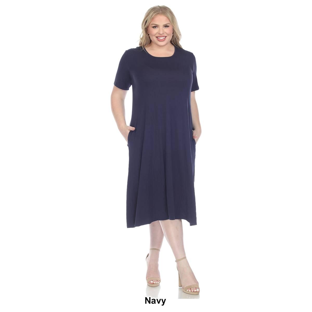 Invest in this Plus Size White Mark short sleeve pocket swing midi dress that will never go out of style. Its basic yet elegant flowy design allows you to accessorize to your heart's content or slip it on for a grab-and-go outfit solution. Designed with practicality in mind, this dress features two functional side slip pockets and is made from premium quality fabric that feels soft against your skin. Embrace simplicity and elegance.