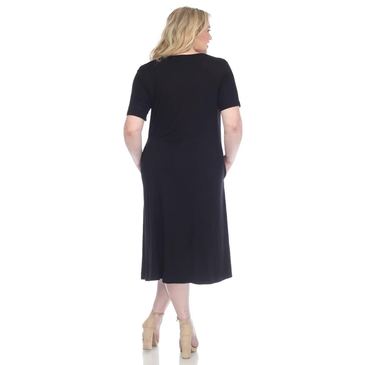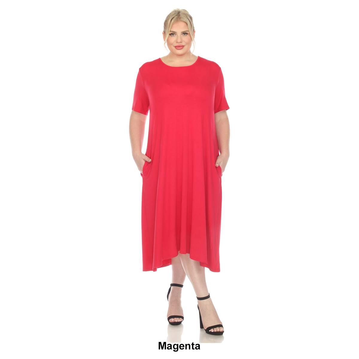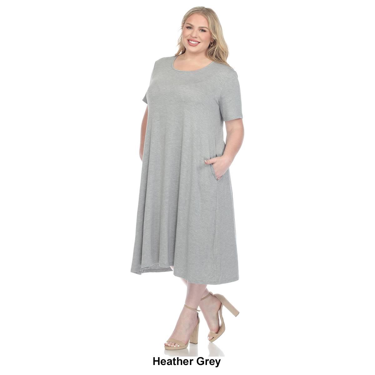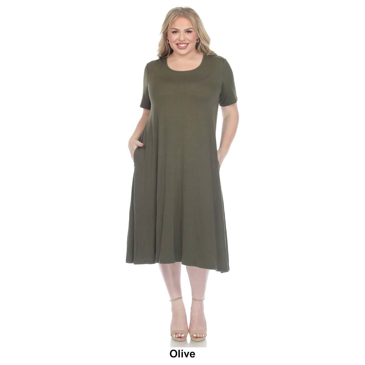 Invest in this Plus Size White Mark short sleeve pocket swing midi dress that will never go out of style. Its basic yet elegant flowy design allows you to accessorize to your heart's content or slip it on for a grab-and-go outfit solution. Designed with practicality in mind, this dress features two functional side slip pockets and is made from premium quality fabric that feels soft against your skin. Embrace simplicity and elegance.