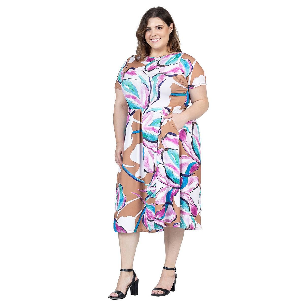 The Plus Size 24/7 Comfort Apparel floral fit & flare midi dress is a delightful fusion of style and comfort. This dress boasts short sleeves, a round neckline, and the ultimate convenience of pockets, making it your go-to piece for both casual and parties. The flattering fit and flare silhouette, coupled with subtle pleats, create a modest yet playful vibe that suits any fashion sensibilities.