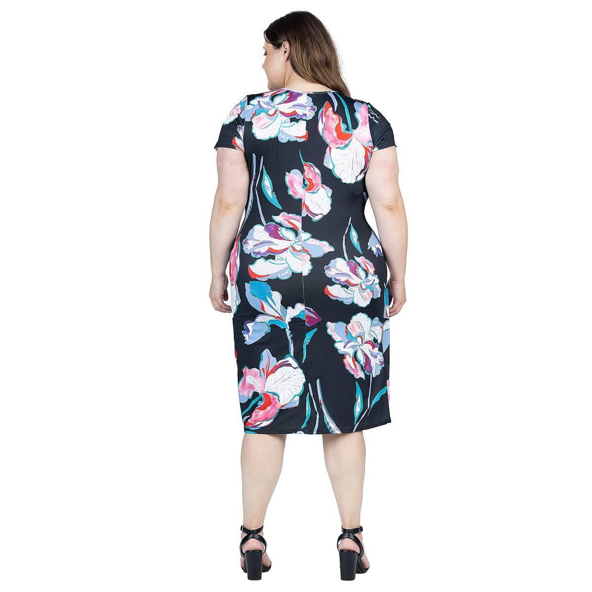 Step into sophistication with the Plus Size 24/7 Comfort Apparel floral knee-length faux wrap dress. The V-neck, short sleeves, and faux wrap detail deliver a tasteful blend of professionalism and style. Crafted with a timelessfloral print, this knee-length dress is a versatile choice for work meetings, cocktail hours, or any refined occasion.