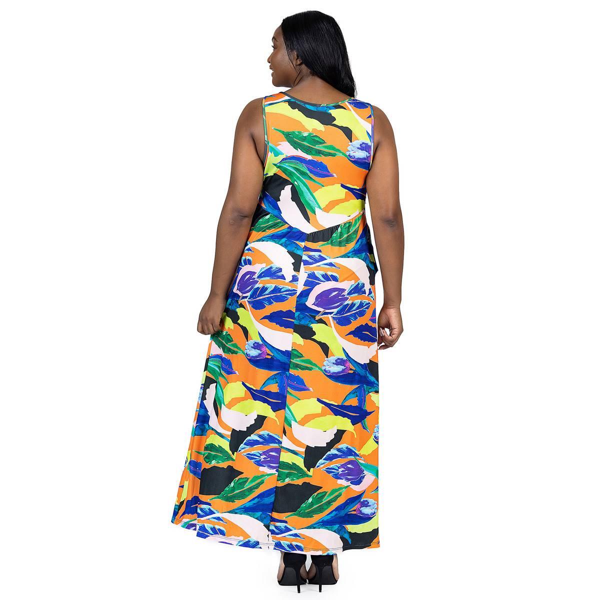 Add color to your warm-weather style with the Plus Size 24/7 Comfort Apparel tropical a-line maxi dress. This sleeveless maxi dress boasts a flattering V-neck, functional pockets, and an A-Line cut for an effortlessly elegant look. The versatility of this maxi dress allows you to effortlessly transition from a casual day out with sandals to a more refined evening look with heels. The dress is adorned with a beautiful bright multicolor floral print, adding a vibrant and contemporary touch to your ensemble.