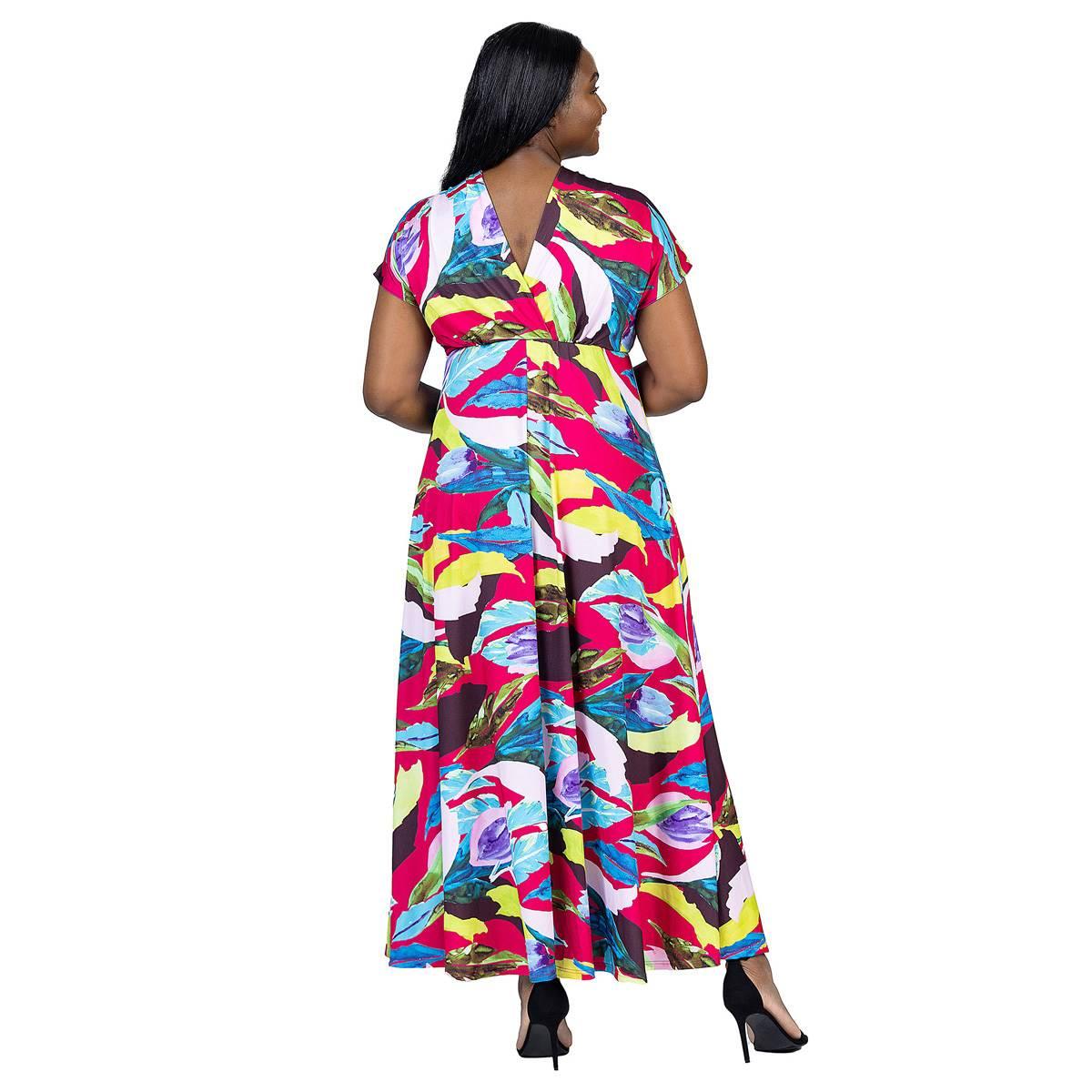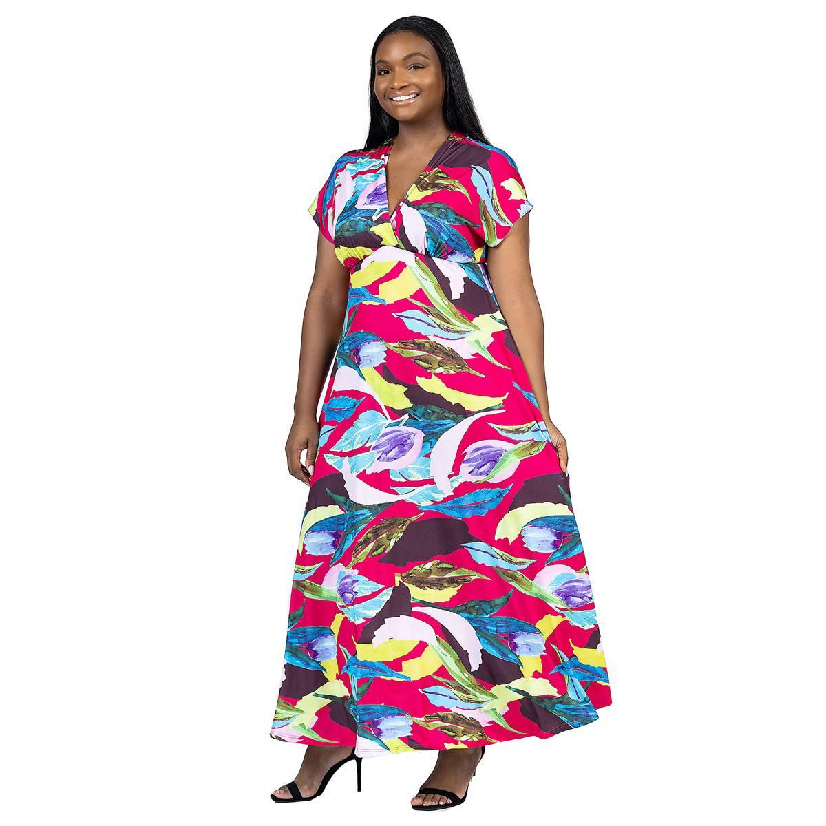 Indulge in the epitome of femininity with the Plus Size 24/7 Comfort Apparel tropical empire waist maxi dress. This maxi dress boasts a v-shaped neckline and back design that exudes sophistication. The kimono style cap sleeves add relaxed elegance, while the empire waist ensures a flattering silhouette for all body types. With a classic maxi length, this dress is a versatile wardrobe staple, seamlessly transitioning from a casual warm-weather event to a laid-back garden wedding.
