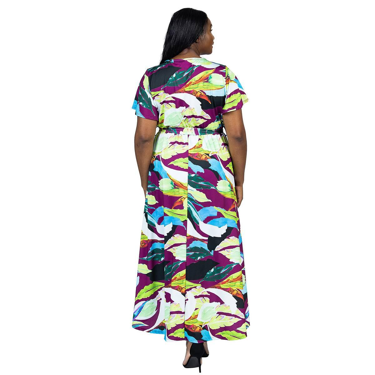 Indulge in vibrant elegance with the Plus Size 24/7 Comfort Apparel floral high-low wrap dress. The dress showcases a chic V-neck and short sleeves that effortlessly blend modern design with timeless grace. The high-low silhouette adds a playful touch, creating an ensemble that seamlessly transitions from day to night. With a faux wrap and belted waist, this dress not only exudes sophistication but also offers a personalized fit that flatters your figure.