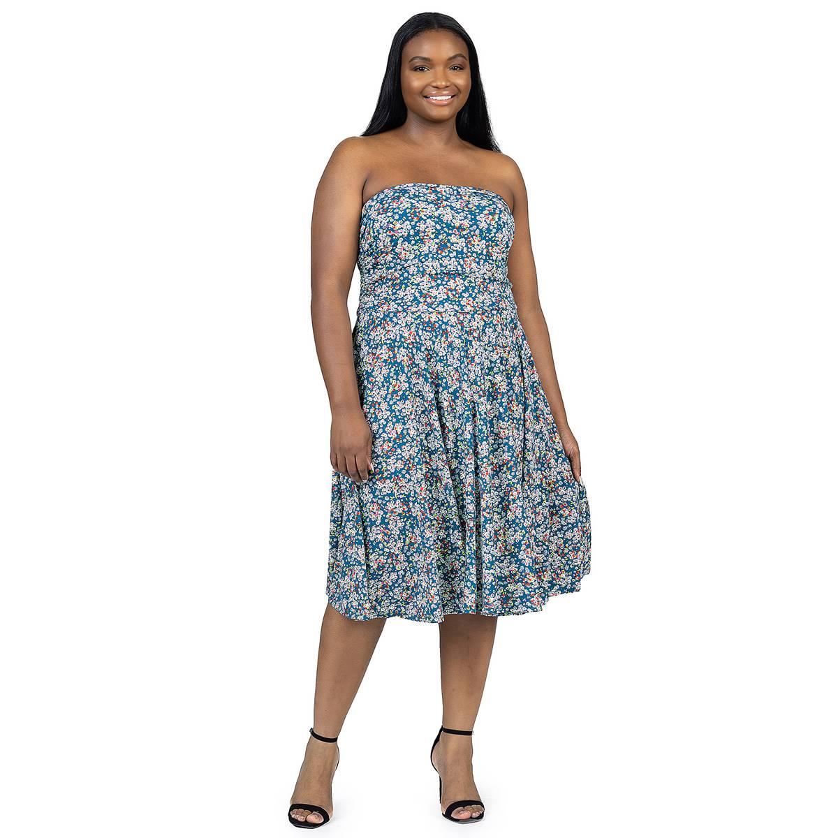 Indulge in the Plus Size 24/7 Comfort Apparel A-line strapless knee-length dress. A versatile piece that effortlessly combines style and comfort. The strapless design and artfully ruched bodice create a sleek and refined silhouette, while the flowy knee-length skirt adds a touch of grace. This dress is the epitome of a classy tube top ensemble, ideal for warm-weather occasions. Whether you are attending a wedding or celebrating Easter, its vibrant teal floral pattern brings a fresh, stylish charm.